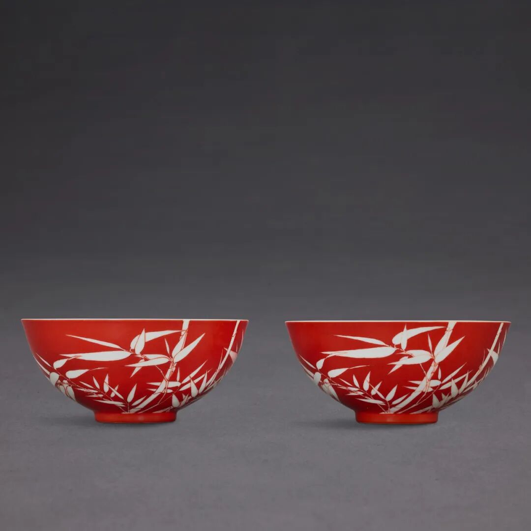 Lot 3503 清乾隆 珊瑚红地留白竹纹小碗一对