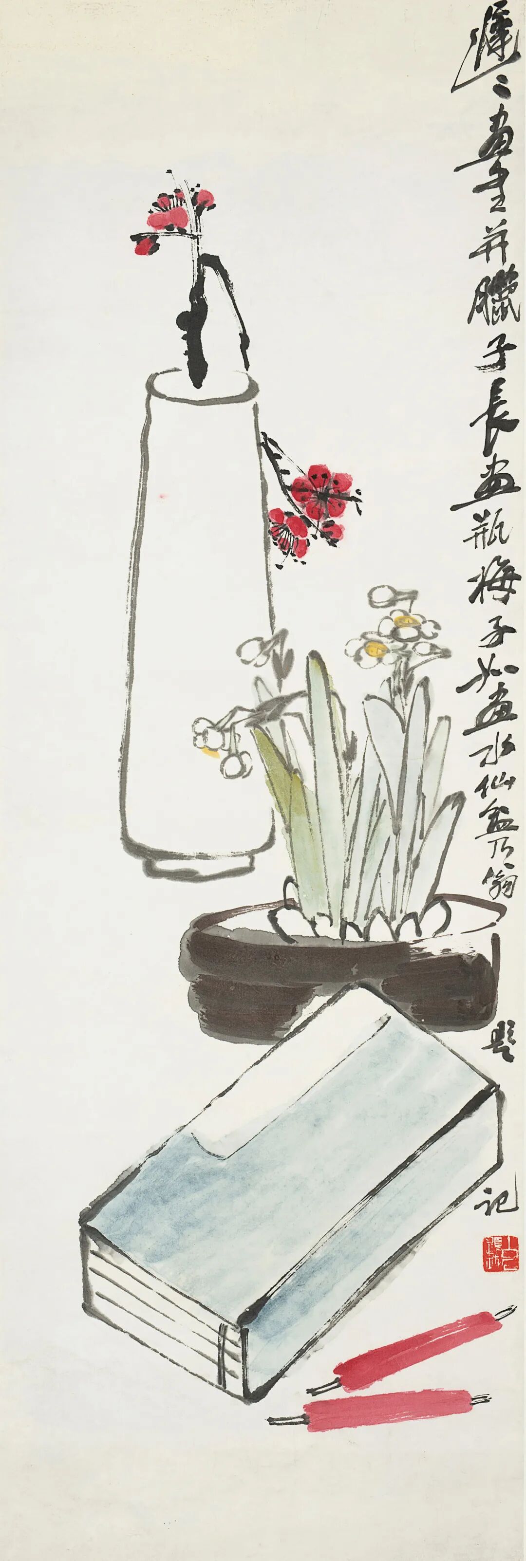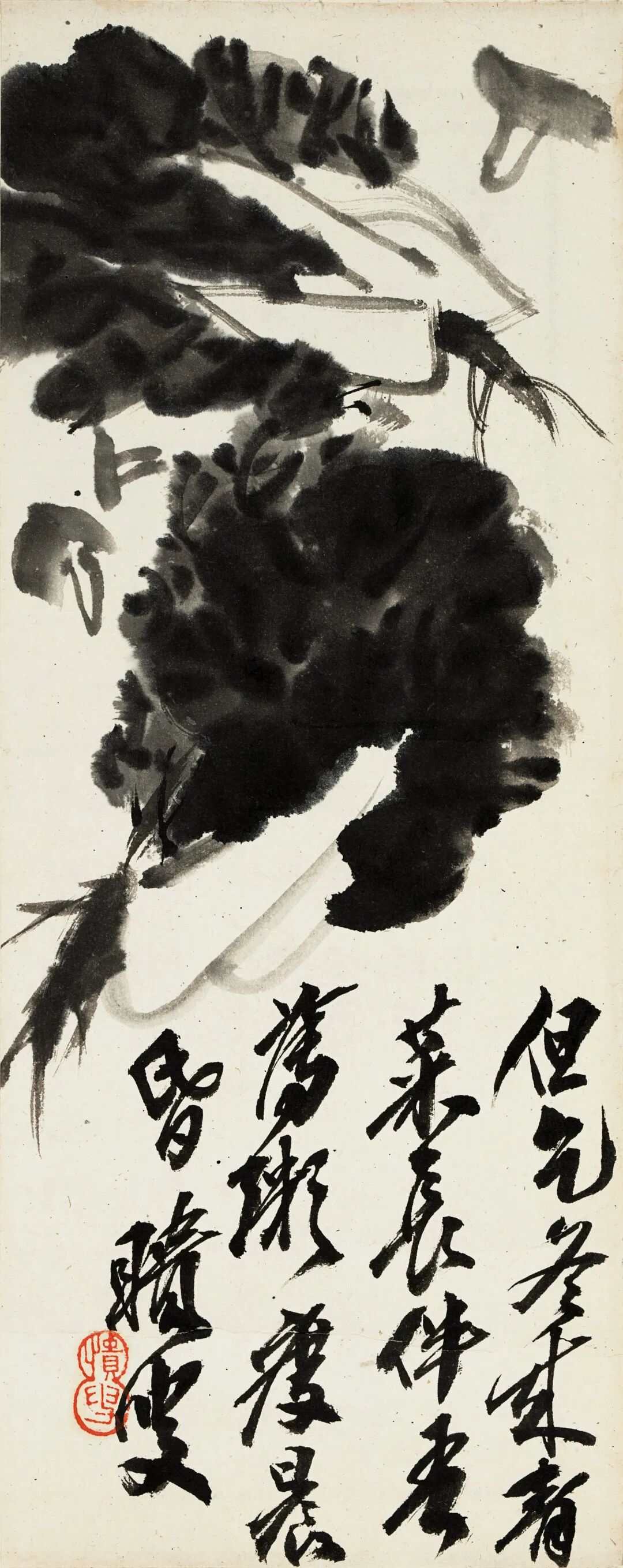 此专题所呈于希宁《凌霄花》鲜明娇艳、赵少昂《桃花飞鸟》生机盎然、粲然可观;齐白石题跋之齐良迟、齐良已、齐子如《清供图》,三子合作已是难得之至,又有乃父白石之题跋,更显珍贵,瓶梅水仙、红烛古籍,诗书雅趣之余,亦可管窥齐门风貌和白石舐犊之情;黄胄、亚明、溥佺三家各胜擅场,为燕京书画社留念所作之四尺整纸的《猫石图》笔意灵动,神韵十足,俱显大师风范。