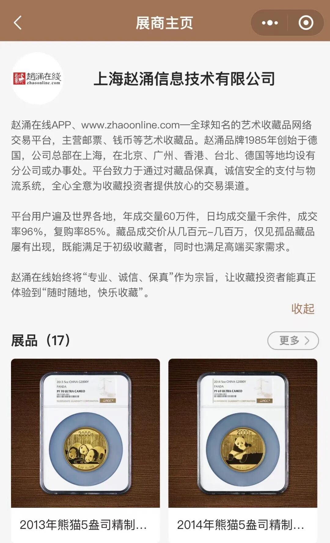 作为备受钱币、邮品爱好者关注的网络平台,赵涌在线也开放了“云上钱博会”展商平台,与广大藏友们随时随地交流分享。值得关注的是,其此番精心筹备了一场“2021北京国际钱币博览会特场”,遴选并展示了一批金银币精品。