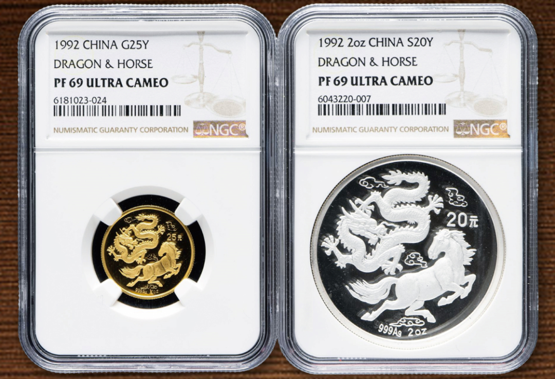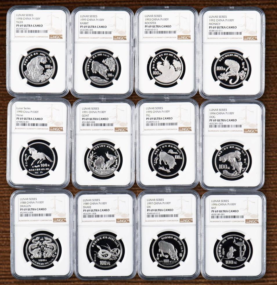 当中众多极具代表性的中国现代贵金属币章尤其值得一看,如1983年中国珍奇动物-丹顶鹤铜镀金样币、1990年龙凤20盎司精制金币、1988年至1999年十二生肖1盎司精制铂币12枚一套、2013年熊猫5盎司精制金币(0001号证书)等均是难得一见的老精稀珍品。