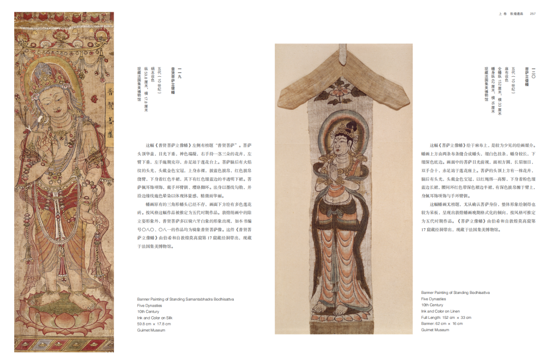 幡画原有的三角形幡头已经不存,画面下方绘有多色莲花砖。按风格这幅作品被推定为五代时期作品。这件《普贤菩萨立像幡》由伯希和自敦煌莫高窟第17窟藏经洞带出,现藏于法国集美博物馆。