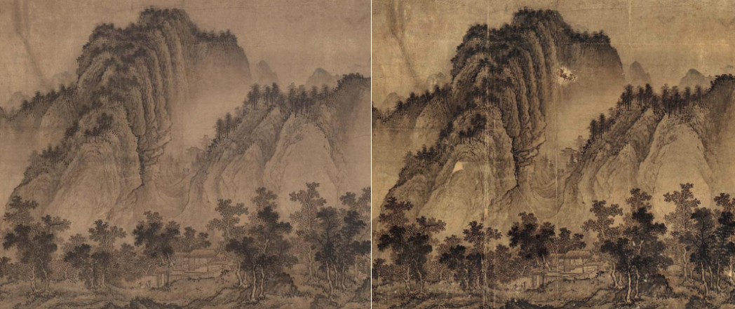 左图为目前文物所在博物馆官网公布图片,右图为翁万戈先生拍摄的当时的文物照片。