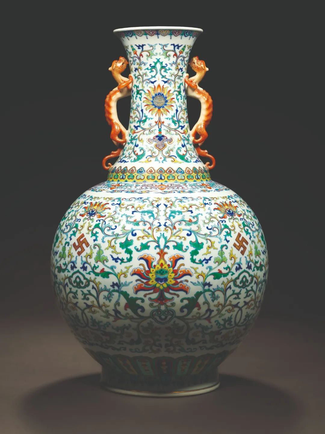 模仿灵芝形态的如意纹,既有“万事如意”的寓意,亦是帝王寿辰常用的图案。同时,瓶身更绘有四个夺目的鎏金「卍」字图案,为历朝历代喜闻乐见的吉祥符号。