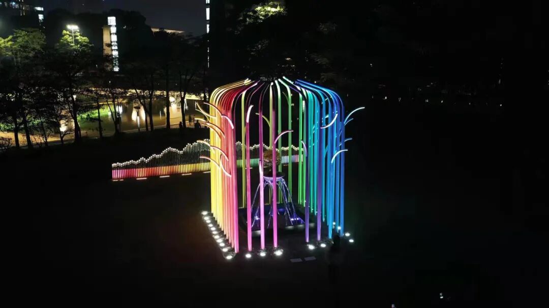 在佛山千灯湖活水公园的草坪上,矗立着一件特别的公共艺术作品:34根色彩鲜艳的钢柱围着一件尖底的盆状陶器,陶器里面种了一颗充满生机的树,而34根钢柱的旁边,还排列着119根高低起伏形似山峦的色柱。