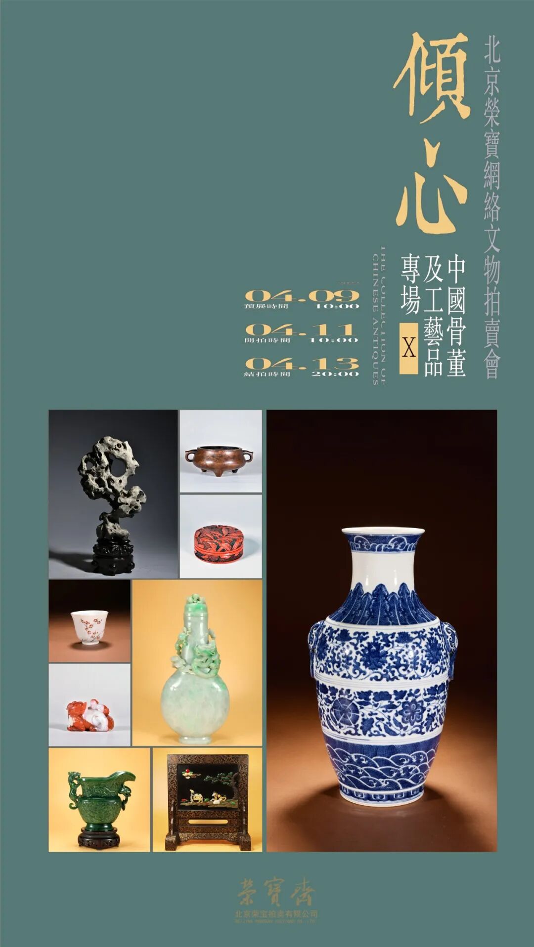 北京荣宝——倾心(X)·中国骨董及工艺品专场网络文物拍卖会将于4月9日10:00—4月11日10:00开启线上预展,并于4月11日10:00开拍,4月13日20:00结拍。