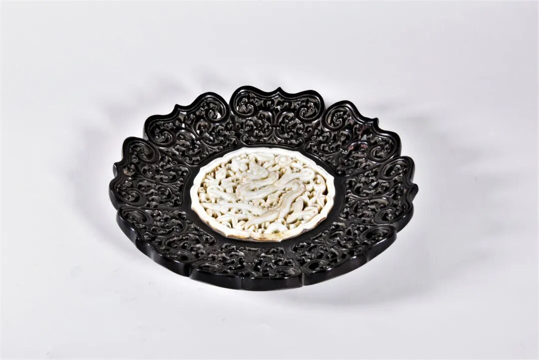 清 紫檀木镂雕嵌龙纹白玉果盘