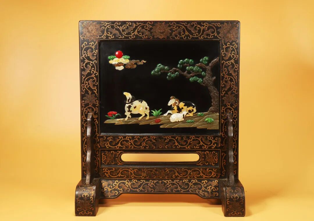清 大漆描金嵌宝三阳开泰插屏