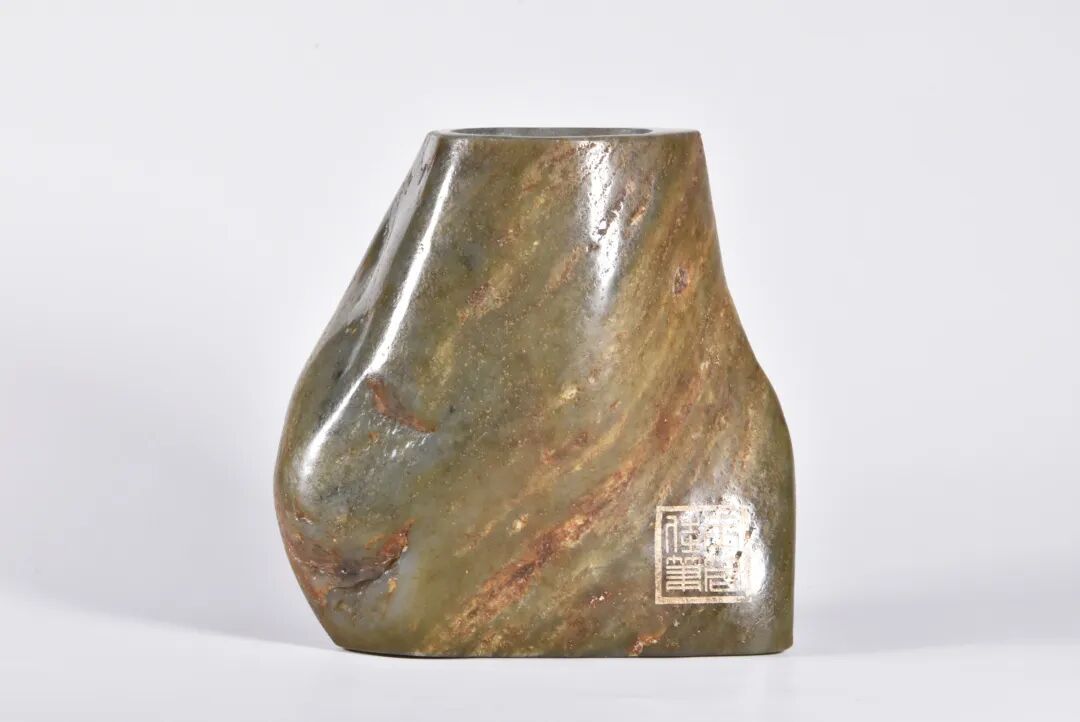清 和田玉留皮诗文花插