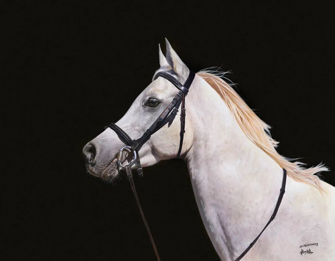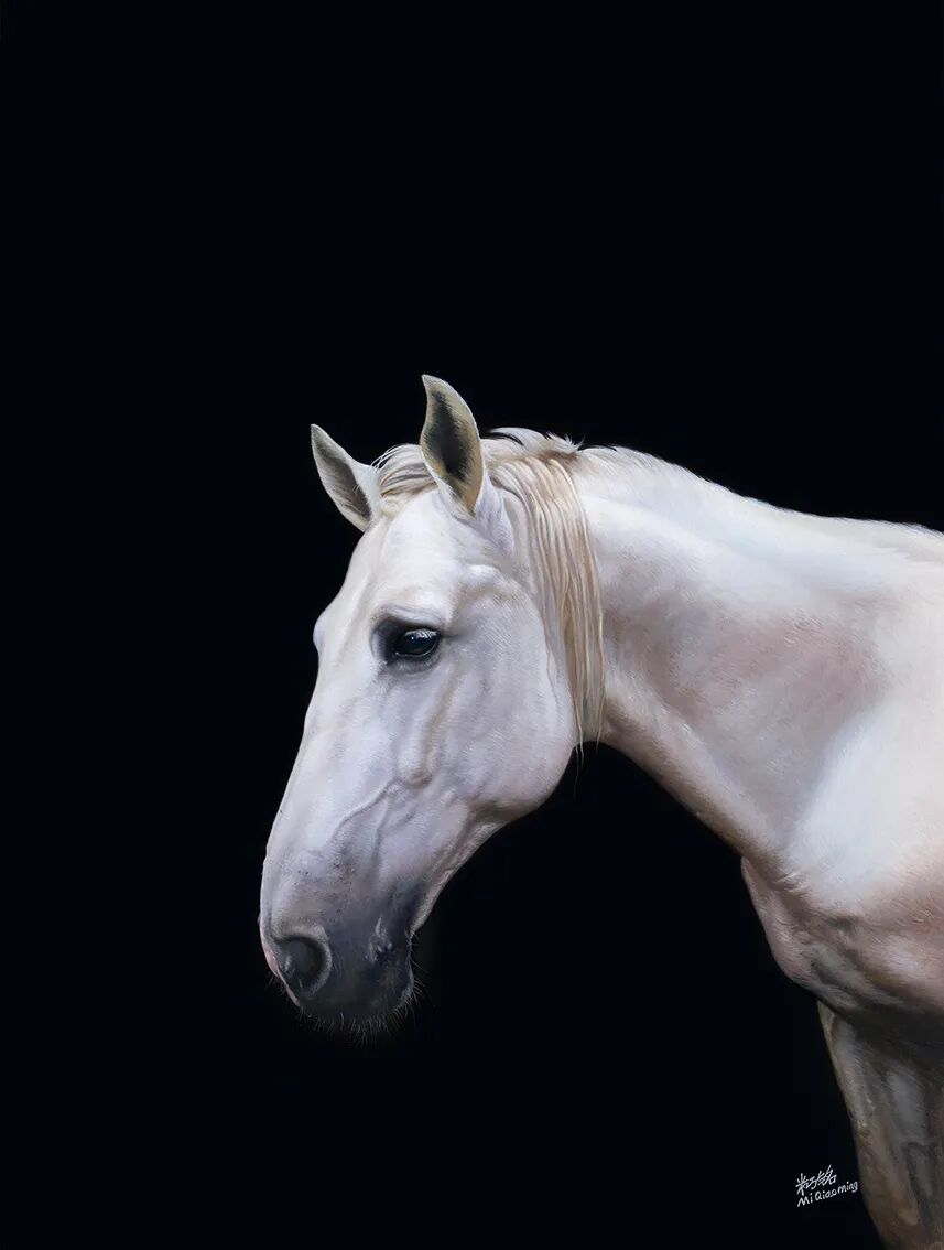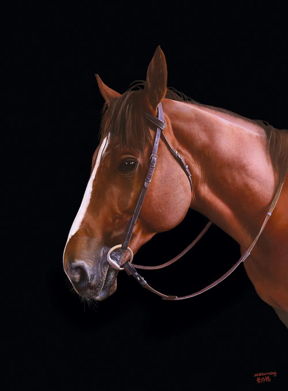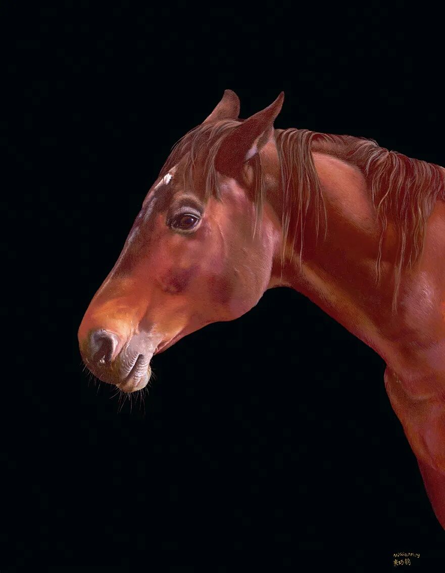 《马》系列作品中,作者将超写实的马儿描绘的深刻细腻,展现了她对东方韵味与西方技法的巧妙结合,这些马或侧身回眸、或垂首沉思、或凝视前方,形态各异,刻画得极为逼真,马面上细腻的鬃毛,凸起的青筋以及脖颈上强韧的线条,有质感的肌理,凸显了画家深厚的造型能力及敏锐的感知力。米巧铭以饱含传统意蕴的用笔,细腻的描摹出马的各种生动传神的眼神,或惊奇、或淡然、或坚定,充满灵韵和生命的力量。