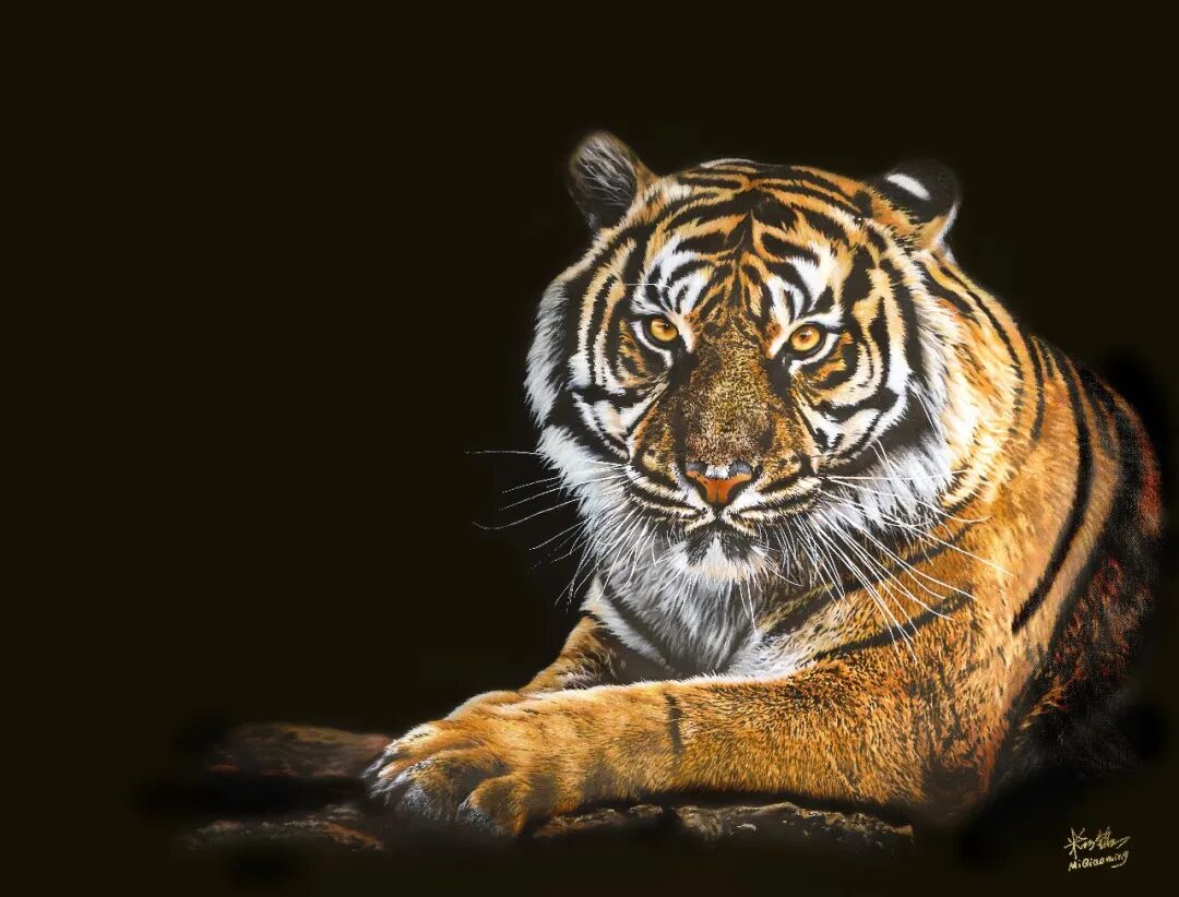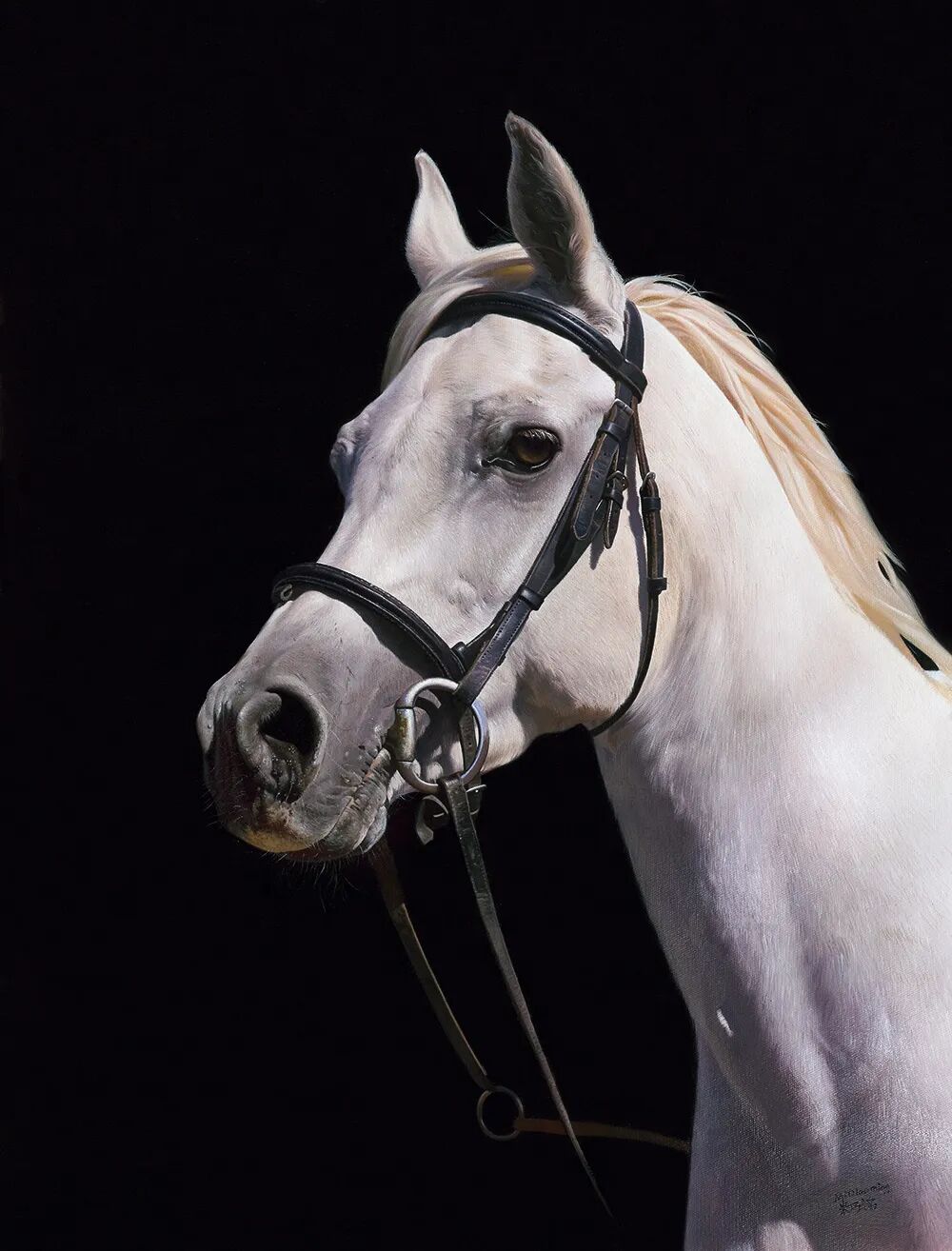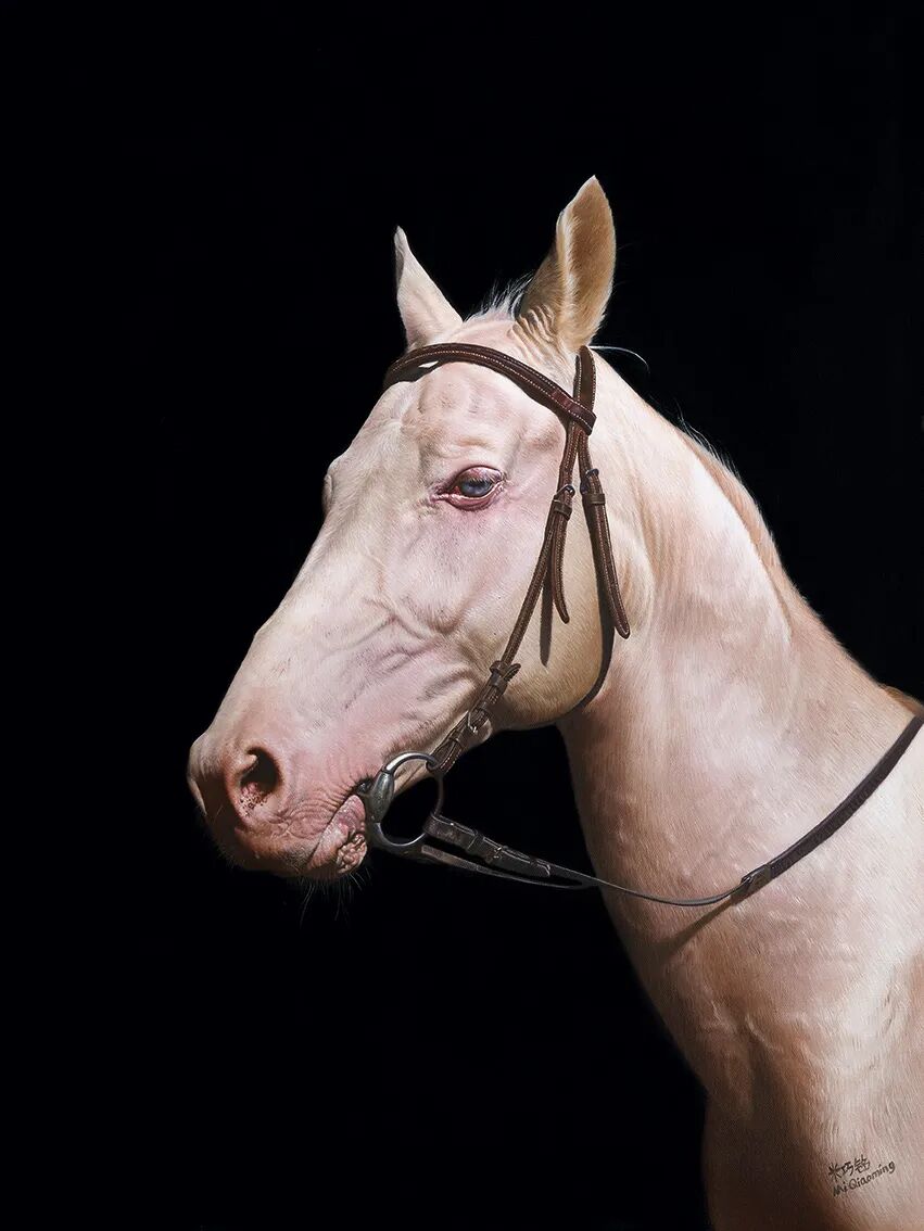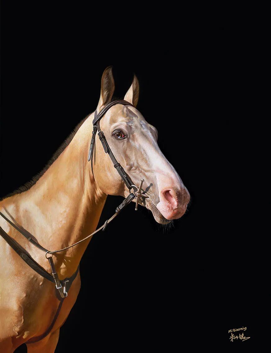 《马》系列作品中,作者将超写实的马儿描绘的深刻细腻,展现了她对东方韵味与西方技法的巧妙结合,这些马或侧身回眸、或垂首沉思、或凝视前方,形态各异,刻画得极为逼真,马面上细腻的鬃毛,凸起的青筋以及脖颈上强韧的线条,有质感的肌理,凸显了画家深厚的造型能力及敏锐的感知力。米巧铭以饱含传统意蕴的用笔,细腻的描摹出马的各种生动传神的眼神,或惊奇、或淡然、或坚定,充满灵韵和生命的力量。