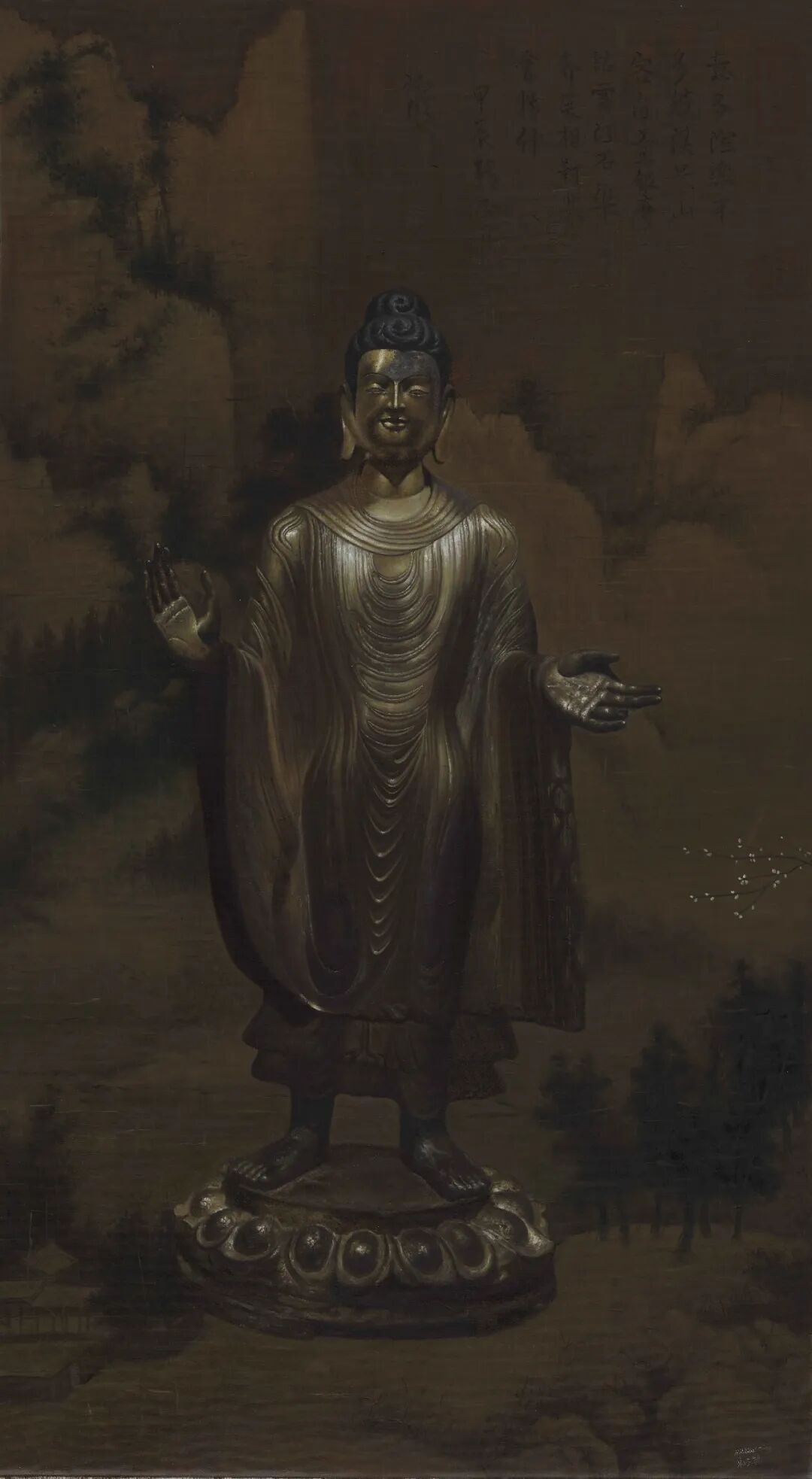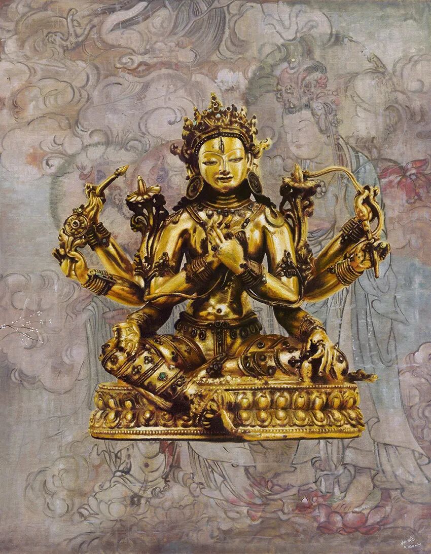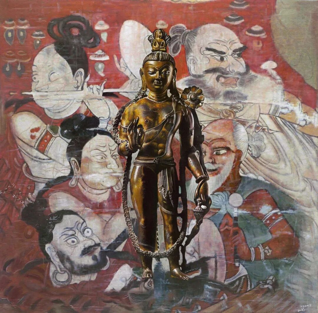 《梵韵吉相》系列作品中,作者将中国古画、敦煌壁画为背景,以写实手法描绘鎏金佛像为主题,再以桃花或木棉花点缀在画面的角落,这三种元素分别代表过去、未来和现在。作品中保留了对中国佛像绘画唯美的东方韵调,还加入了当代东方美学审美体系的图式,力图实现传统佛像绘画向当代美学形式的转换。