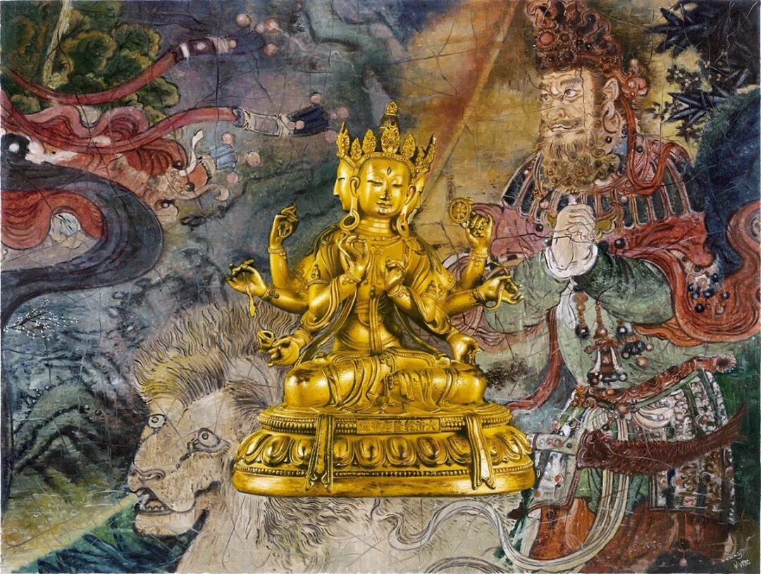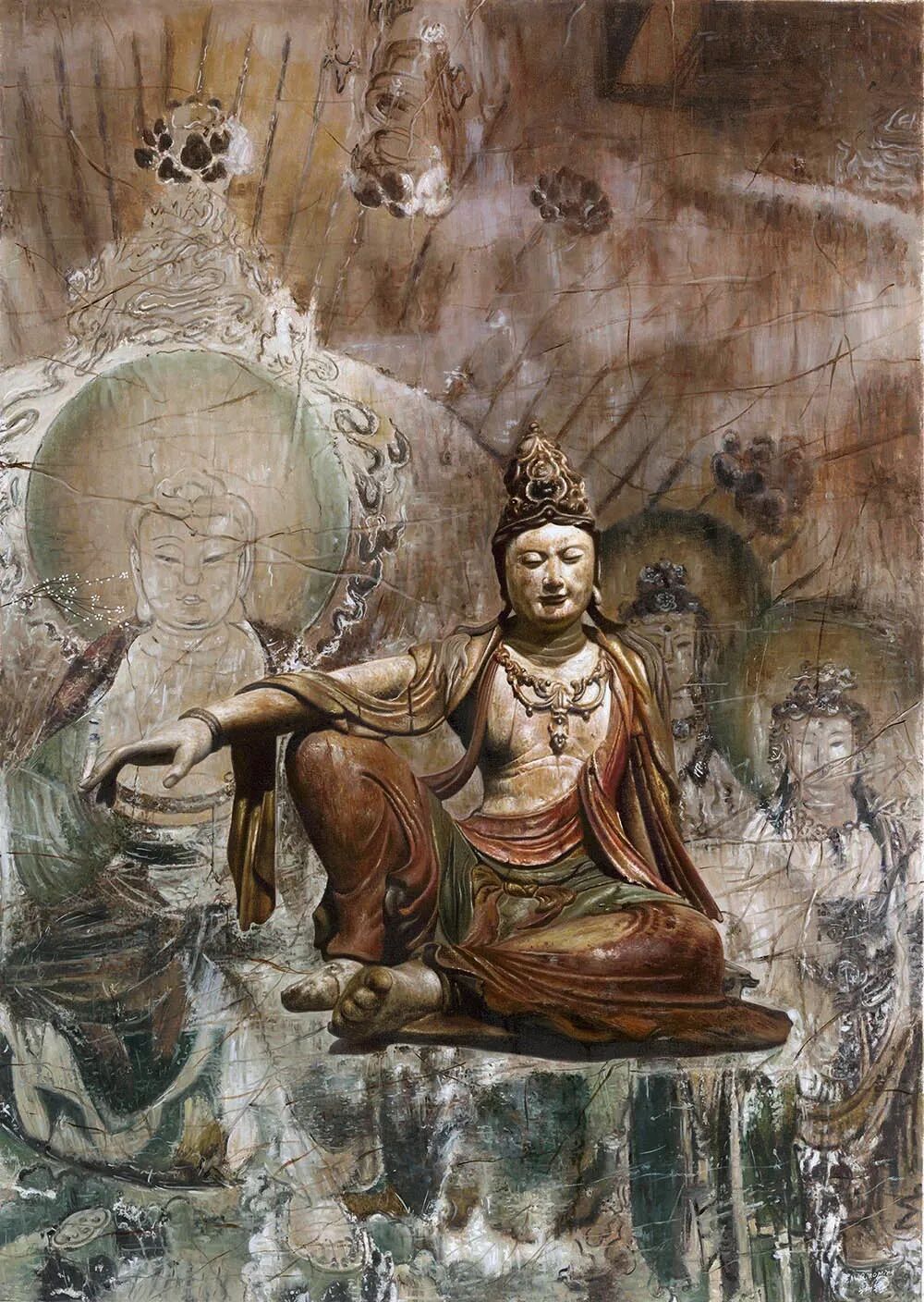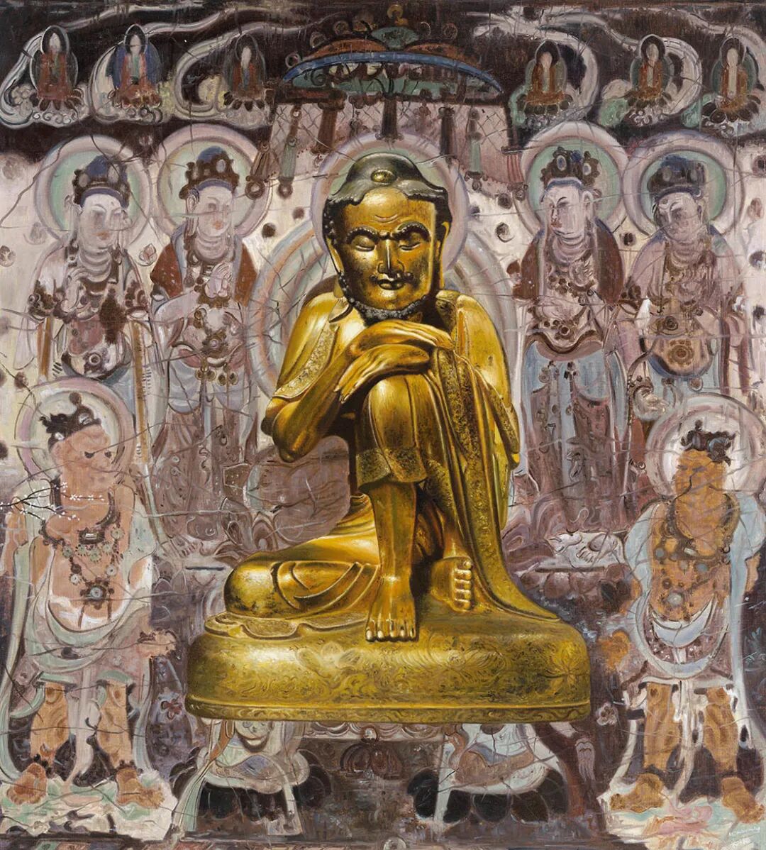 《梵韵吉相》系列作品中,作者将中国古画、敦煌壁画为背景,以写实手法描绘鎏金佛像为主题,再以桃花或木棉花点缀在画面的角落,这三种元素分别代表过去、未来和现在。作品中保留了对中国佛像绘画唯美的东方韵调,还加入了当代东方美学审美体系的图式,力图实现传统佛像绘画向当代美学形式的转换。