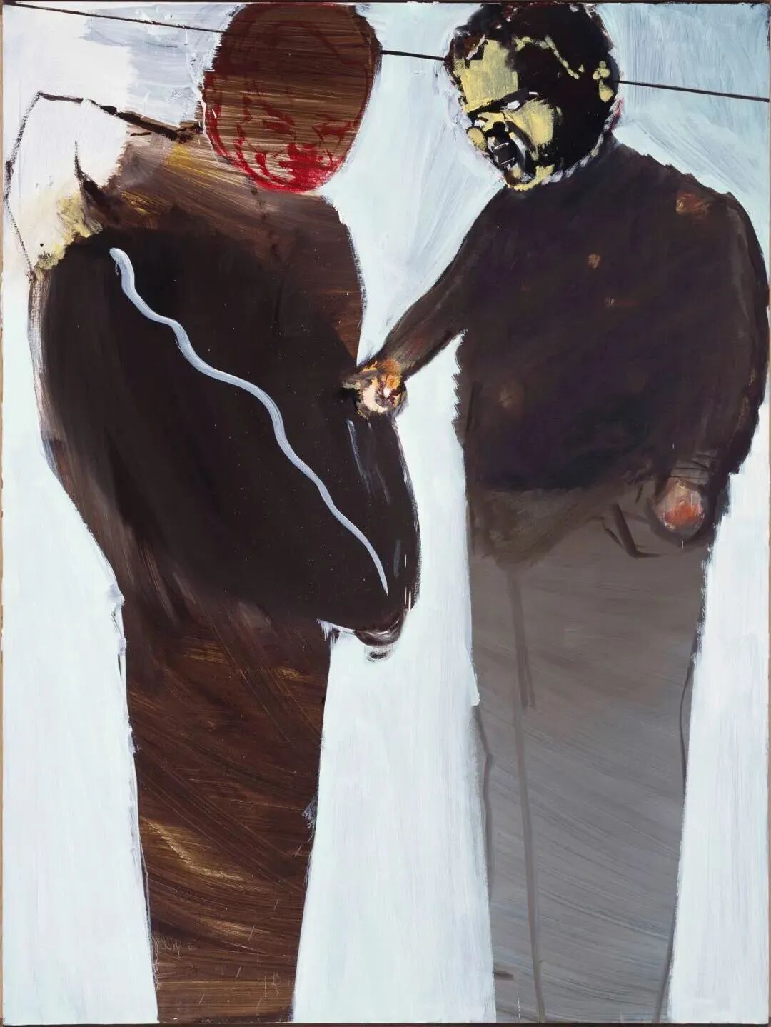 2008年后,“马”的形象在马轲的绘画中逐渐淡去,而更加接近日常生活叙事的风格则替代成为他新的关注重点。2012年,马轲的第一个重要个展,“杯弓蛇影”在北京展出。与展览同名,《杯弓蛇影》称得上是马轲经过一段时间归纳和总结后创作的典型作品。从“马轲的视角”来看,相对站立的两个人 ,正在进行一场尴尬的交流或对抗,同时在对方不可知的角度也呈现出让人反感的人性的侧面。