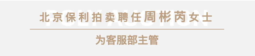 北京保利拍卖聘任周彬芮女士为客服部主管。周彬芮女士毕业于中央美术学院艺术史专业,硕士研究生学位,2013年加入北京保利拍卖现当代艺术部。多年的积累与沉淀为她转换角色奠定了坚实基础,周彬芮女士将带领客服团队坚持“以客户为中心”的服务理念,竭诚为广大藏家和客户提供高品质服务。