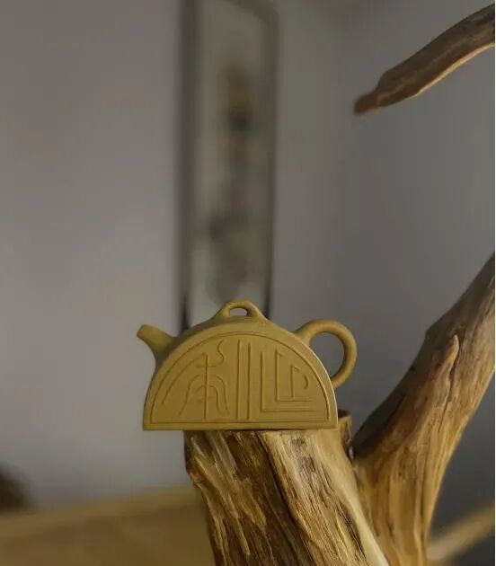 壶身整体像瓦当的形状,线条清晰流畅,界面分明美妙;圈把弯流,比例协调,虚实有度;嵌盖制成半月式,巧妙的与壶体融合在一起。