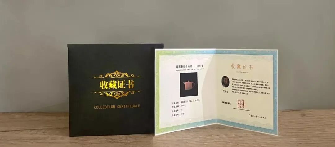 礼盒内附有每一把壶相应的证书信封,打开信封,证书上不仅可见作品和名家的简介,同时也标识出限定的总发行量、当前作品编号,并有工艺师的署名印章,珍藏价值高。