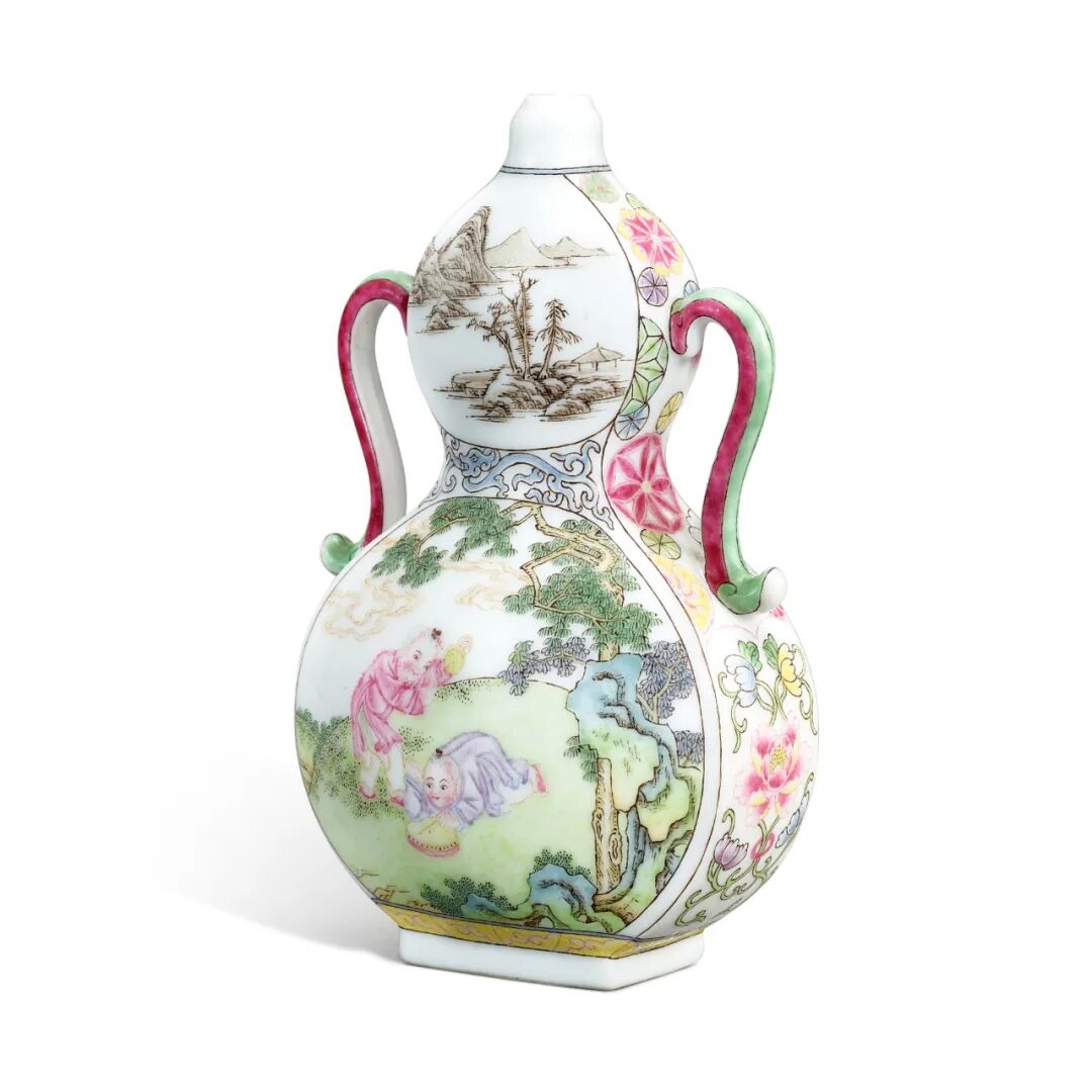 拍品估价:2,000,000 - 3,000,000港币Lot 3631清 翠玉瑞兽钮双龙活环耳瓜棱式三足盖炉拍品估价:13,000,000 - 18,000,000 港币来源:卢芹斋(1880-1957年)收藏,此后家族传承1.Michel Beurdeley,Kristofer Schipper、张馥蕊及班伯讷合撰,《云雨》,拉特兰,1969年,页74-76、 96、103、113-114及1162.贝索烈,《Les Jardins du Plaisir: rotisme et art dans la Chine ancienne / Gardens of Pleasure: Eroticism and Art in China》,巴黎,2003年(英文再版,慕尼黑、柏林、伦敦、纽约,2010年),页6、10、17、70-893.贝索烈,《Concubines and Courtesans: Women in Chinese Erotic Art》,布鲁塞尔,2010年,图版42、681.《Liebeskunst: Liebeslust und Liebesleid in er Weltkunst》,雷特伯格博物馆,苏黎世,2002年,编号154-1572.高居翰等,《Le Palais du printemps. Peintures érotiques de Chine》,赛努奇博物馆,巴黎,2006年,页180-1913.《Seduced: Art & Sex from Antiquity to Now》,Barbican Art Gallery(巴比肯美术馆),伦敦,2007年,页128-1294.《The Chinese Pleasure Garden: Erotic Art from the Bertholet Collection》,亚洲艺术博物馆,柏林,2011年5.《愉悦满园:贝氏中国古代情色艺术珍藏》,香港,2014年,图3-5、20拍品估价:900,000 - 1,200,000 港币1.贝索烈,《Les Jardins du Plaisir: rotisme et art dans la Chine ancienne / Gardens of Pleasure: Eroticism and Art in China》,巴黎,2003年(英文再版,慕尼黑、柏林、伦敦、纽约,2010年),页58-692.va Patrícia Murakezy,〈Ming. Emperors, Artists and Merchants in Ancient China〉,《Journal of Eurasian Studies》,2013年10-12月,卷V,第4期,页881.高居翰等,《Le Palais du printemps. Peintures érotiques de Chine》,赛努奇博物馆,巴黎,2006年,页46-692.《Seduced: Art & Sex from Antiquity to Now》,Barbican Art Gallery(巴比肯美术馆),伦敦,2007年,页1263.《The Chinese Pleasure Garden: Erotic Art from the Bertholet Collection》,亚洲艺术博物馆,柏林,2011年4.《Ming: keizers, kunstenaars en kooplui in het oude China》,新教堂,阿姆斯特丹,2013年,页128-1345.《愉悦满园:贝氏中国古代情色艺术珍藏》,香港,2014年,图23-26、31-32拍品估价:500,000 - 700,000 港币1.贝索烈,《Les Jardins du Plaisir: rotisme et art dans la Chine ancienne / Gardens of Pleasure: Eroticism and Art in China》,巴黎,2003年(英文再版,慕尼黑、柏林、伦敦、纽约,2010年),页41、102-1162.贝索烈,《Concubines and Courtesans: Women in Chinese Erotic Art》,布鲁塞尔,2010年,图版71.高居翰等,《Le Palais du printemps. Peintures érotiques de Chine》,赛努奇博物馆,巴黎,2006年,页70-952.《愉悦满园:贝氏中国古代情色艺术珍藏》,香港,2014年,图6、9Lot 3639 清乾隆 珐琅彩庭园婴戏图绶带耳葫芦扁瓶