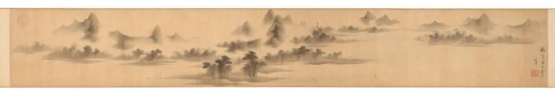 注:本幅讲究笔墨情韵,在绢本上仍能保持墨色层次分明,变化多样,以淡设色醒眼,表现出简淡秀润之态,意境深邃。董其昌一生以仿古人山水入手,取其内在精神,强调文人畅神写意的情趣,平淡天真。