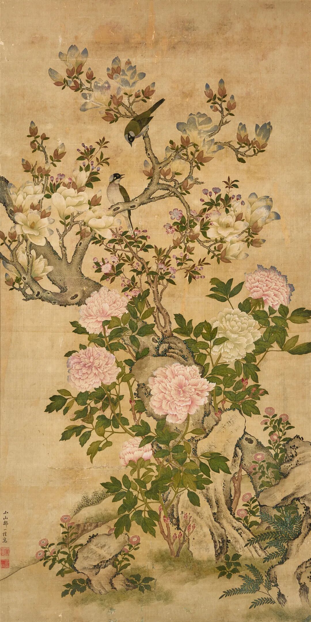 注:所描绘之四季花卉包括牡丹、荷花、菊花及梅花,墨色层次丰富,干湿浓淡皆全,笔法多变,清雅而不落俗套,尽显「我自用我法」。本幅为邓基哲旧藏,其官至国子监录学,长子乃邓钟岳(1674-1748),康熙十六年状元。本作品曾藏于曹仲英先生「默斋」,于2016年在洛杉矶郡立美术馆《曹氏家族藏17世纪中国绘画》展览中展出,获学术界参与研究,回响无穷。