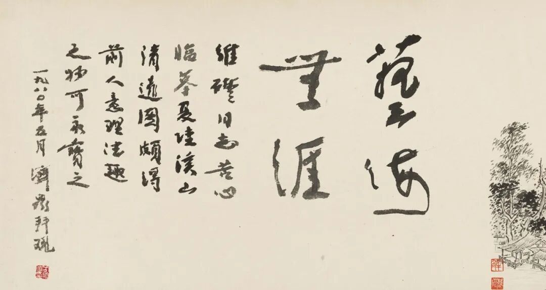 2、上款人“越之”为李越之(1920-1997),平素雅好文艺,擅诗词,与李可染友善。有《李越之诗词选》存世,诗集中有《赠李可染诗》、《春节怀旧寄可染》、《闻李可染将来海滨》、《祝可染同志八十寿》、《悼老友可染同志》、《题李可染六牛图》等多首与李可染有关的诗作。本件作品签条为李越之自题。