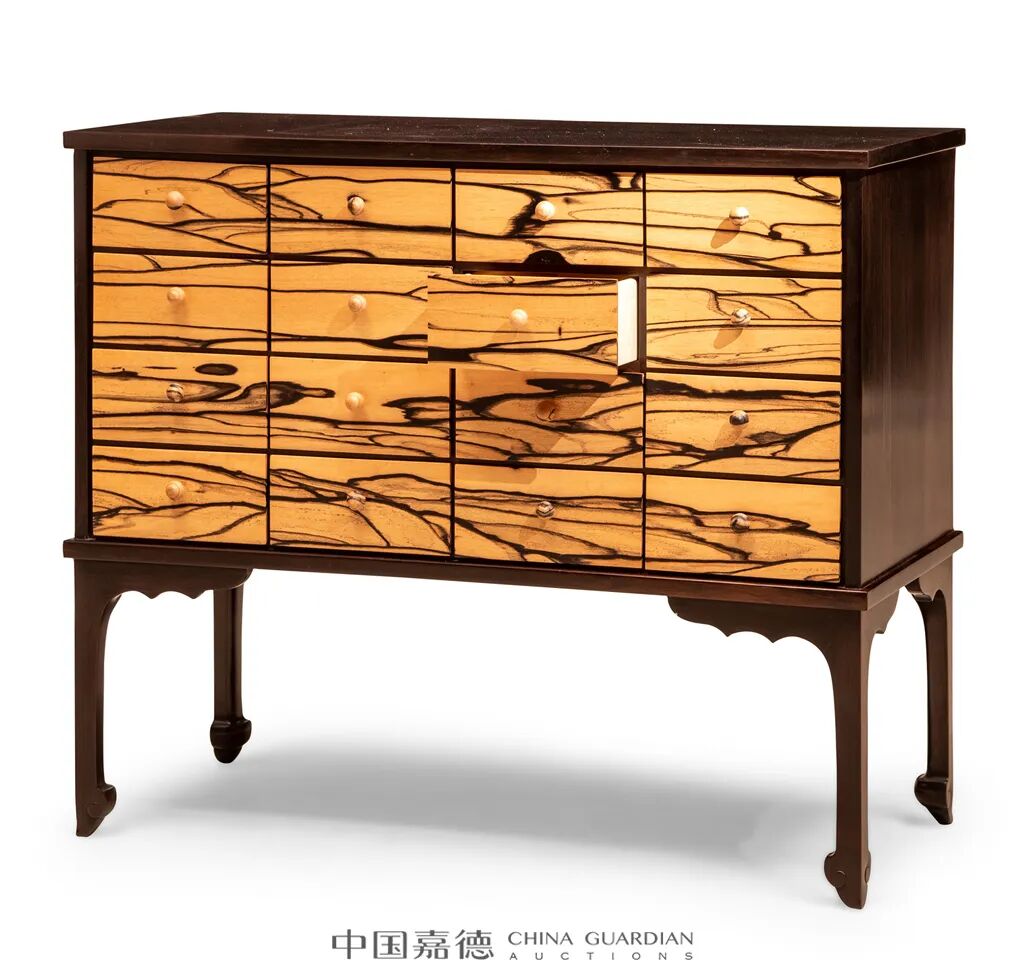 黑柿木的纹理变化多端,有直线细纹、卷曲云纹和不规则山水状纹,本件拍品的抽屉脸上,便呈现出水波纹、山水纹,诗意盎然。十六具深抽屉,实用与美感兼得。底座以乌木制成,无束腰,接马蹄足,底收如意形,无牙条,牙头呈多折曲线行与腿足上部交圈。整体造型简洁实用,充满宋韵。