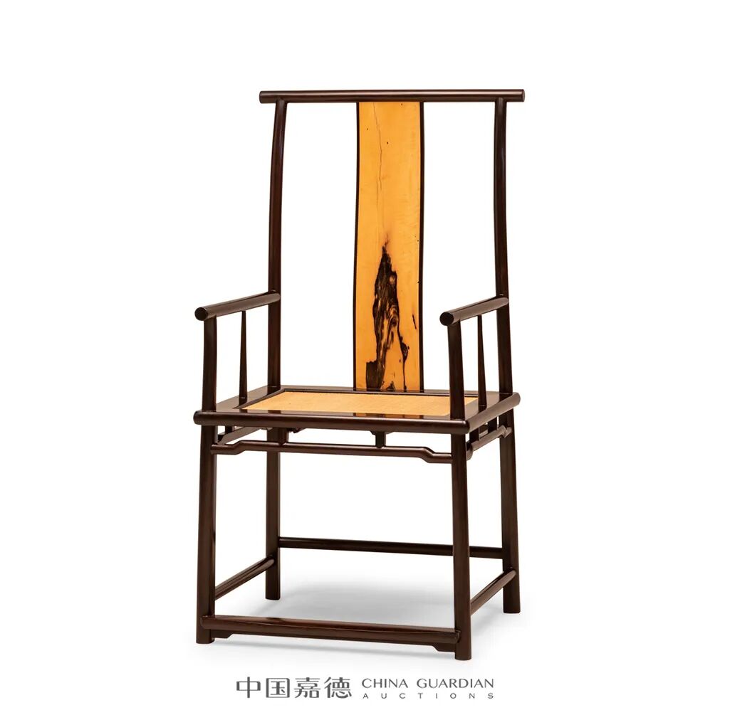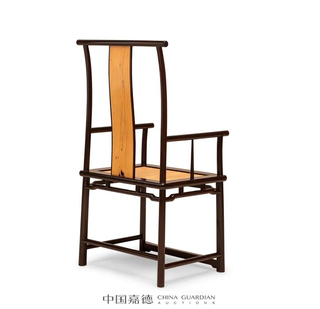 官帽椅以黑酸枝、黑柿木制,搭脑平直,与后腿上部相交,靠背板三弯式,以黑酸枝镶嵌黑柿木,扶手平直,鹅脖与前腿一木连做,联邦棍上细下粗。座面格角攒边框镶嵌屉面,边抹素混面,腿足圆材,有侧脚,腿足上部安罗锅枨,上安两矮老,腿足间装步步高管脚枨,正面管脚枨下安光素刀牙板。