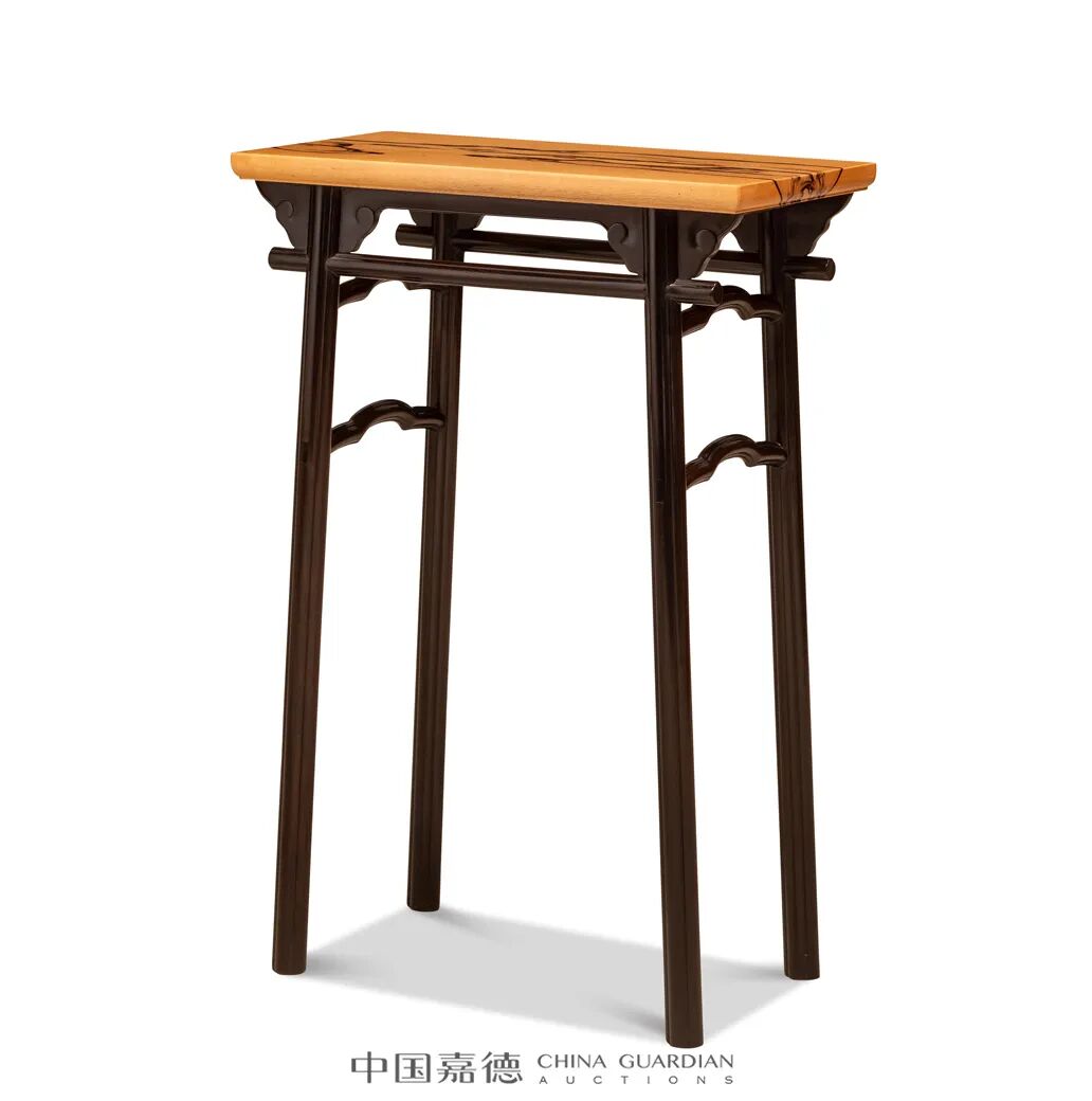 香案以黑柿木、黑酸枝制,案面独板,腿足圆材,有侧脚,正面各有一根顺枨,侧面各有两根罗锅枨,边抹与顺枨间安牙条和如意云纹形牙头。