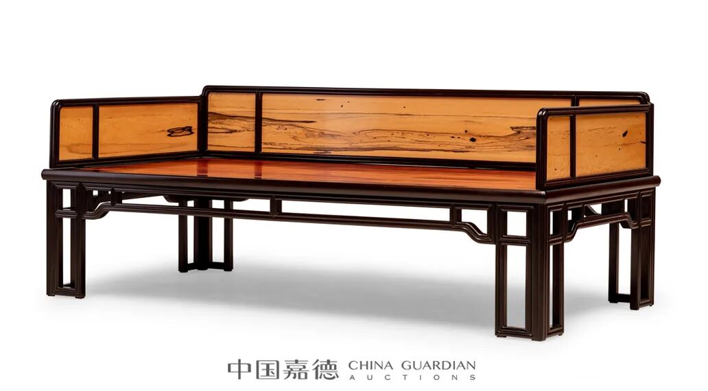 罗汉床三屏风式,背板及两侧板劈料攒边框装黑柿木板心,纹饰天然美观,宛如一幅幅山水画。床面以黑酸枝格角攒边框镶嵌花梨木板心,边抹素混面。腿足直落于地,与牙条、牙头均格角攒边框而成,劈料做,以其空间的通透化解腿足的沉重之感,颇具几何美感。