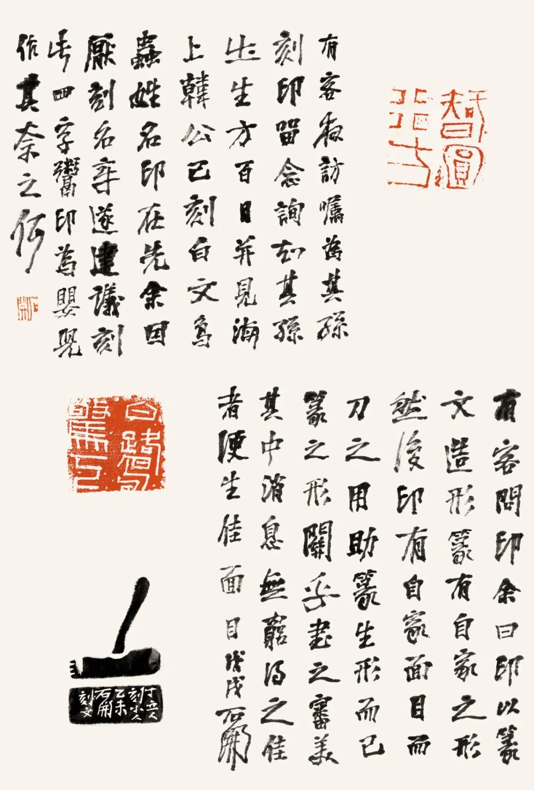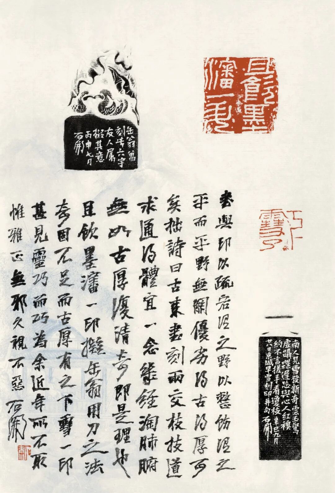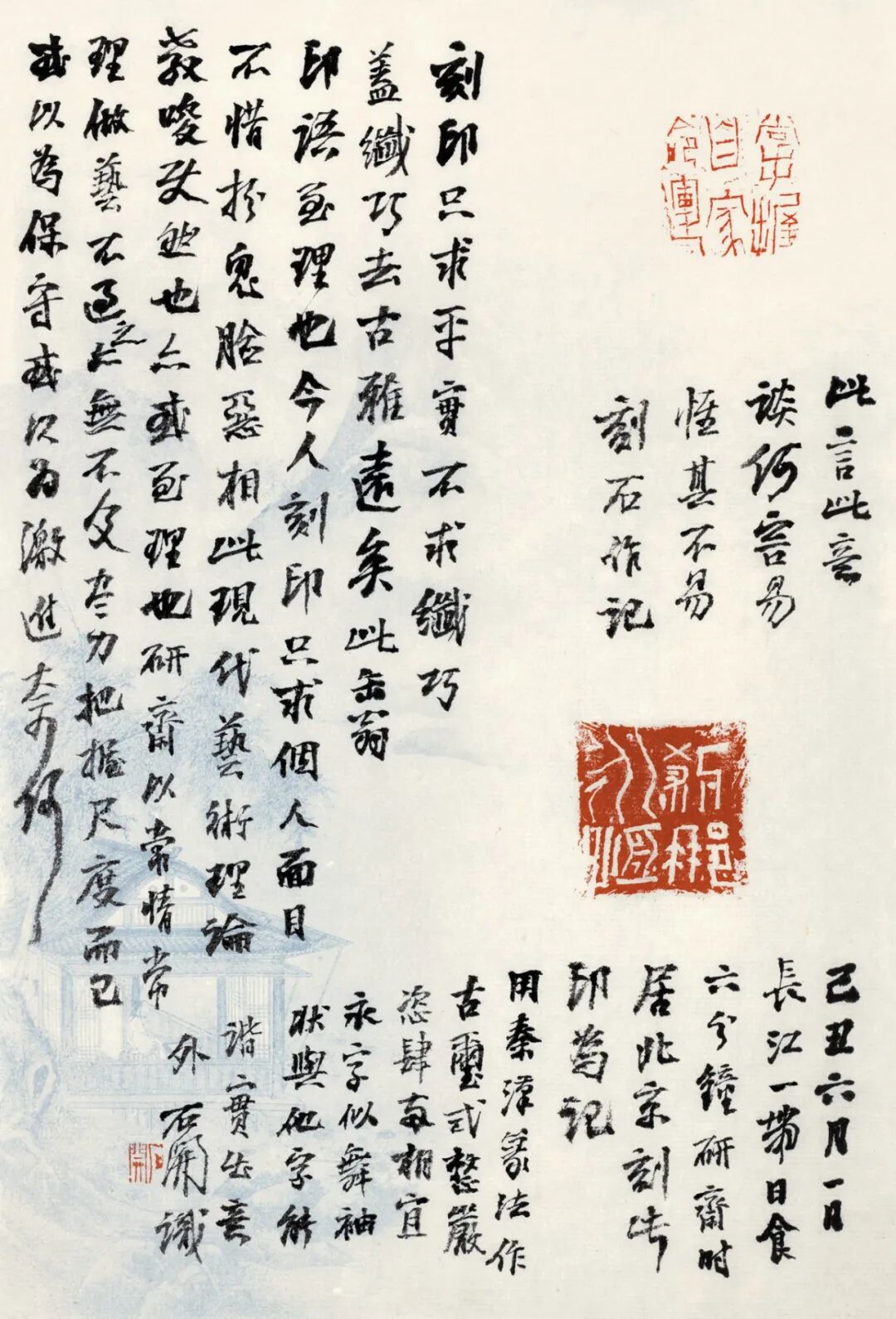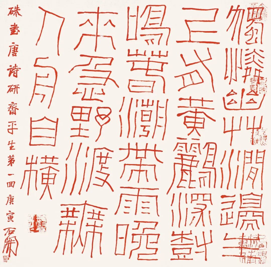 除了常见的双刀刻法,单刀刻法也偶有其人。所谓单刀,即一刀一笔画,一边光滑一边毛糙的那种。这种刻法是石章边款的变种。我所见者有两位名家。已故的篆刻前辈陈子奋是其一,他的砚铭如同他的印款合一无異,只是字略显小。这种刻法有一胜处,自身有防伪功 能他人难以模仿。他的砚铭也近百件,可惜没有印刷集子。当代王镛是另一家,他的印章边款本来就独树一 帜,放大刻在砚上,驰骋极见创意,据说用鑿子锤刻,令人遐想不胜。