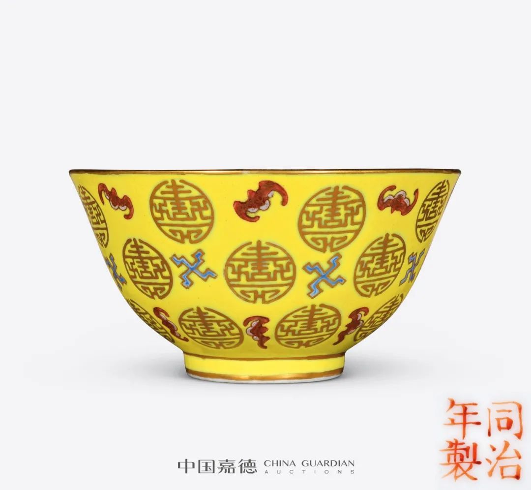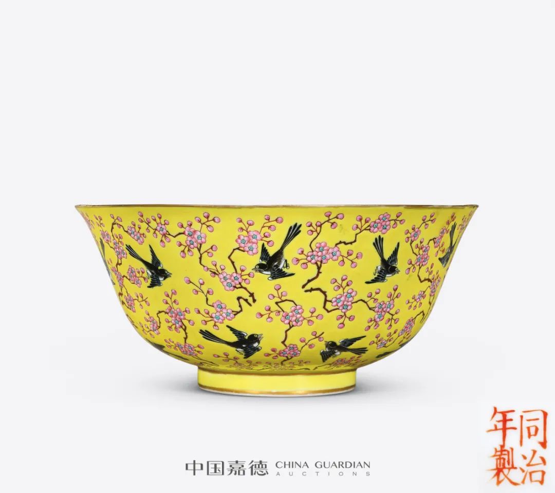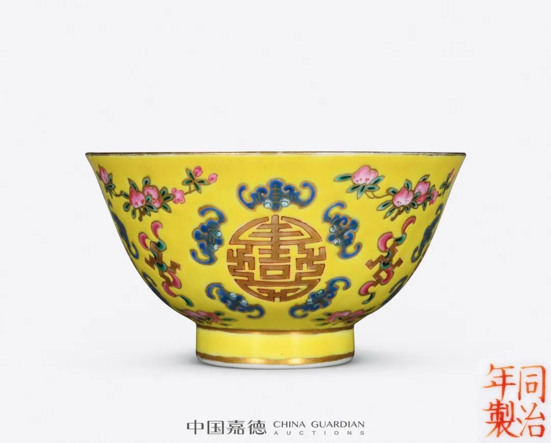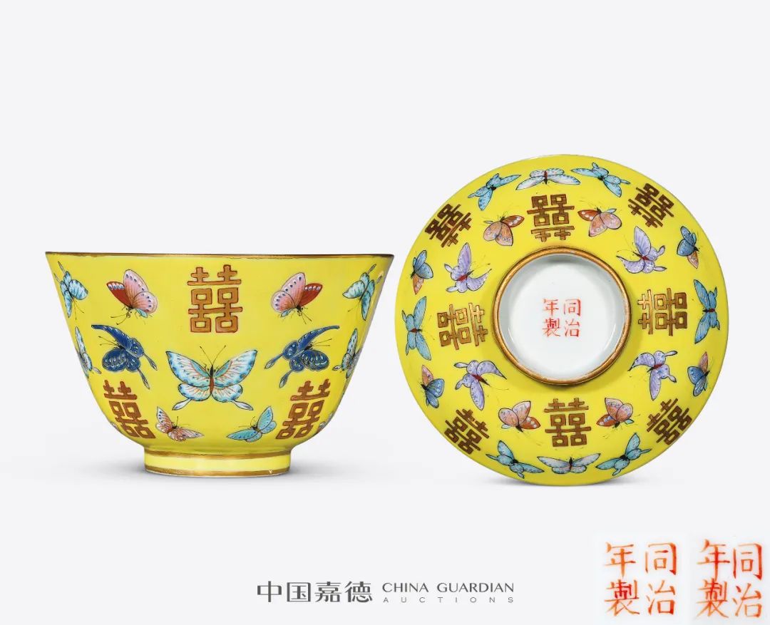值得注意的是,十四份花色中“黄地喜雀梅碗样”和“黄地金双喜字百蝶碗样”画样名称均有重复,根据实物资料及故宫博物院所藏20种大婚瓷画样对比得知,“黄地喜雀梅碗样”按梅花装饰有无树干可分两种。“黄地金双喜字百蝶碗样”中“喜”字则有四喜和八喜之别。Lot 3904