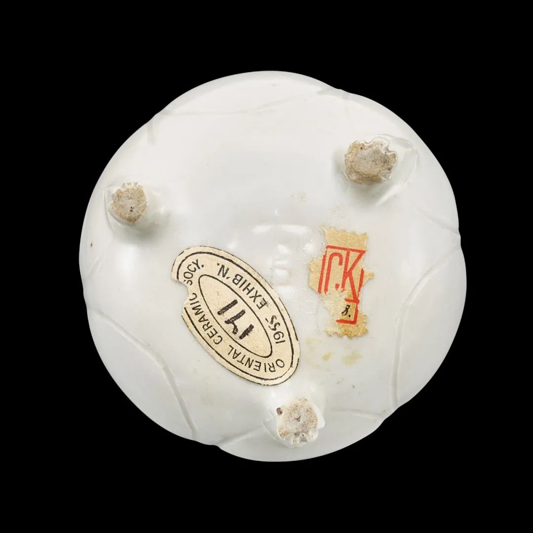肯普旧藏中,此批二十一件白瓷与青瓷,为同一私人藏家所珍贮,包含二件纪年瓷器(拍品编号3698纪年977、拍品编号3690纪年1089),二例书「官」字铭文(拍品编号3688及3692),及数例知名藏品。白瓷中最引人注目者,如莲瓣纹三兽足水盂(拍品编号3692),原断为河北邢窑器,类同器形可见于邢、定窑。「官」字铭文,虽少见,但邢、定二窑均有作例,唐、五代、辽、北宋窑址皆有标本,使用年代甚广,自九世纪晚期至十一世纪。本品釉色牙白,莲纹细致,应造于定州一带。