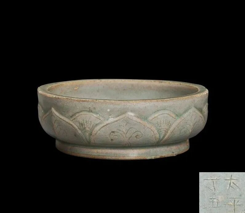 越窑青釉莲瓣纹浅碗 《太平丁丑》款