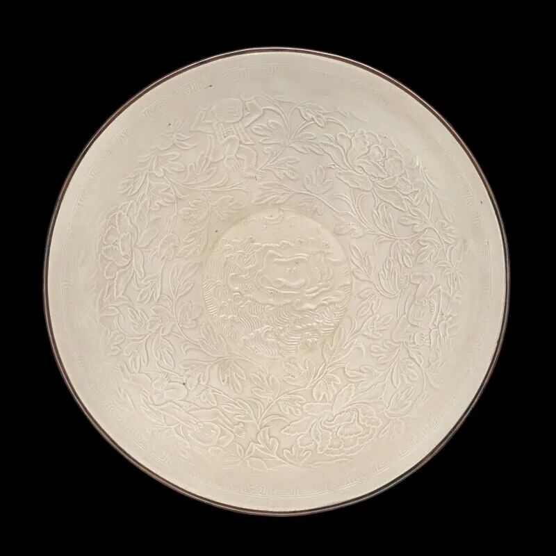 北宋至金 定窑白釉印牡丹婴戏及犀牛望月纹碗
