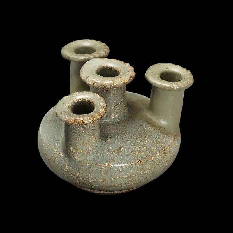 同样备受珍视的,还有拍品编号3703,冰裂青釉,带四管,属杭州官窑器,昔称香插或花插,应为南宋书案陈设雅器。