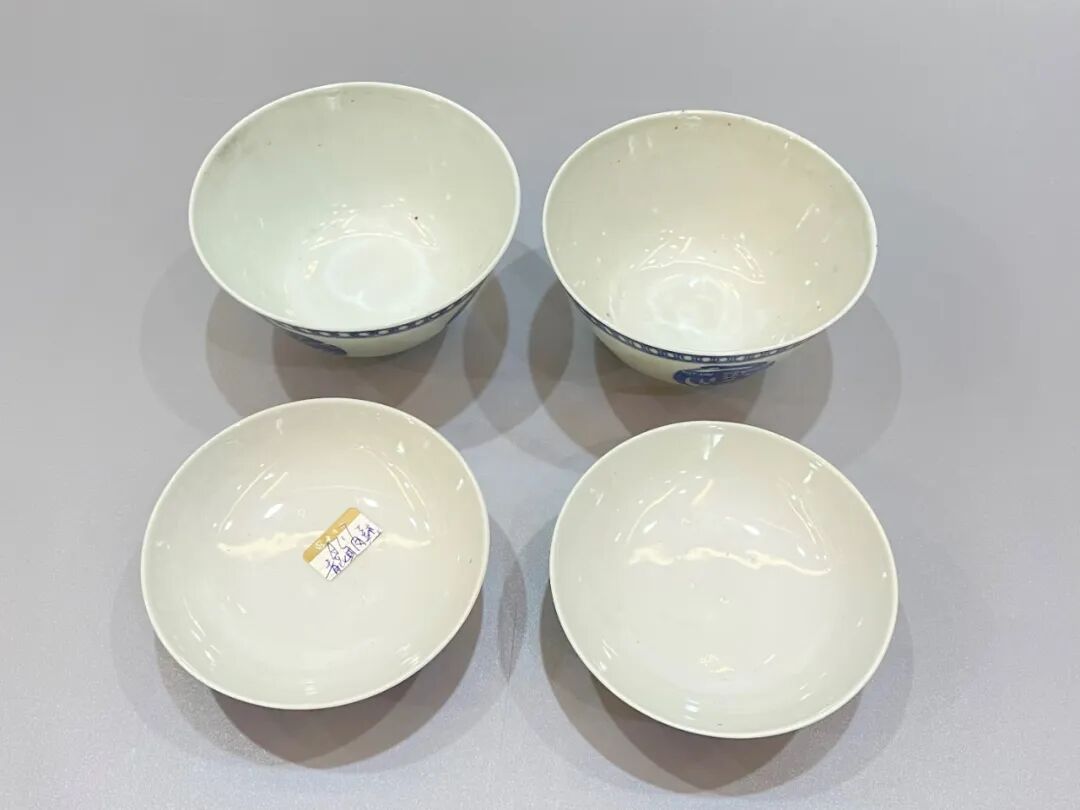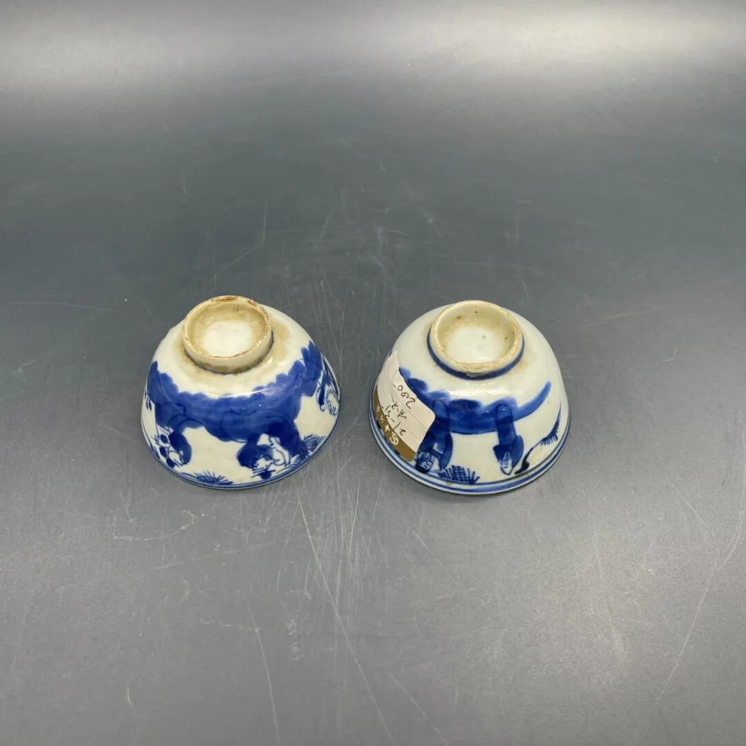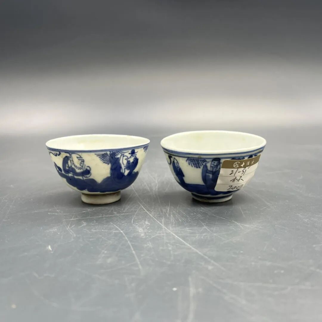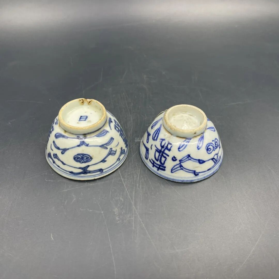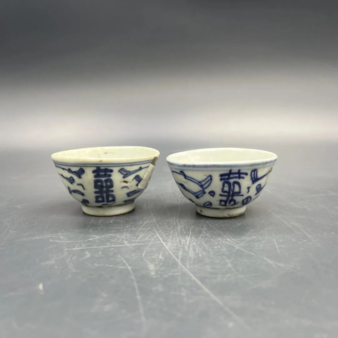 此对杯成对完整,器形规整,青花发色鲜亮。通体施白釉,以青花装饰,口沿处绘青花双圈,壁绘青花双团凤纹,瓷质细腻通透、造型美观别致、做工精细,具观赏性及收藏价值。