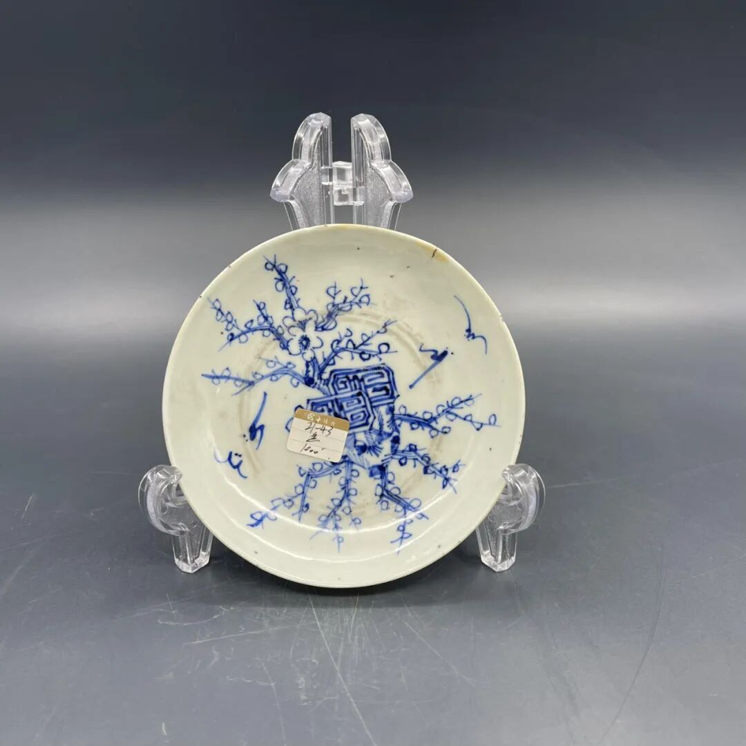 此盘青花发色淡雅宁静,绘画手法工质细腻。盘心绘一青花“方寿”纹,围以蝙蝠、梅花等图案。饰有“万福万寿”、“福寿齐眉”之意。