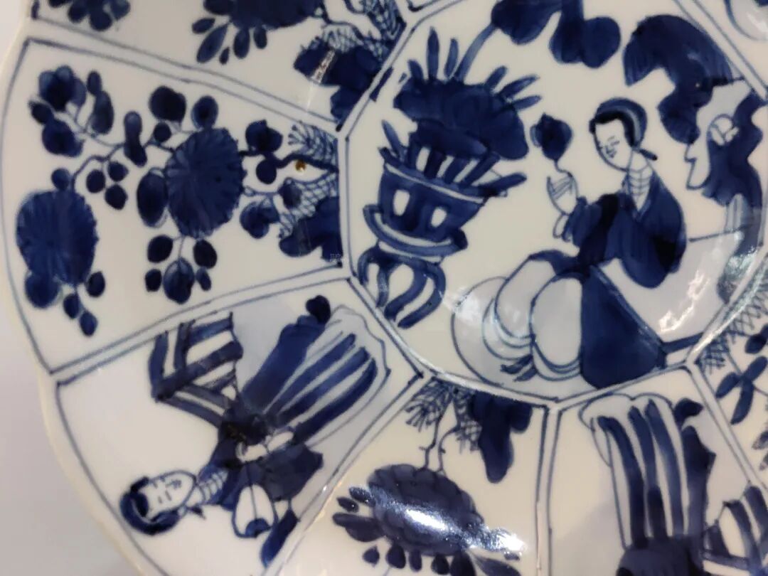 此盘为葵口,折沿,弧腹,圈足。青花发色鲜亮,有层次,胎釉细腻,时代风格明显。胎体细密而坚硬,通体内外绘青花纹饰,绘画灵动清晰,格调高雅。