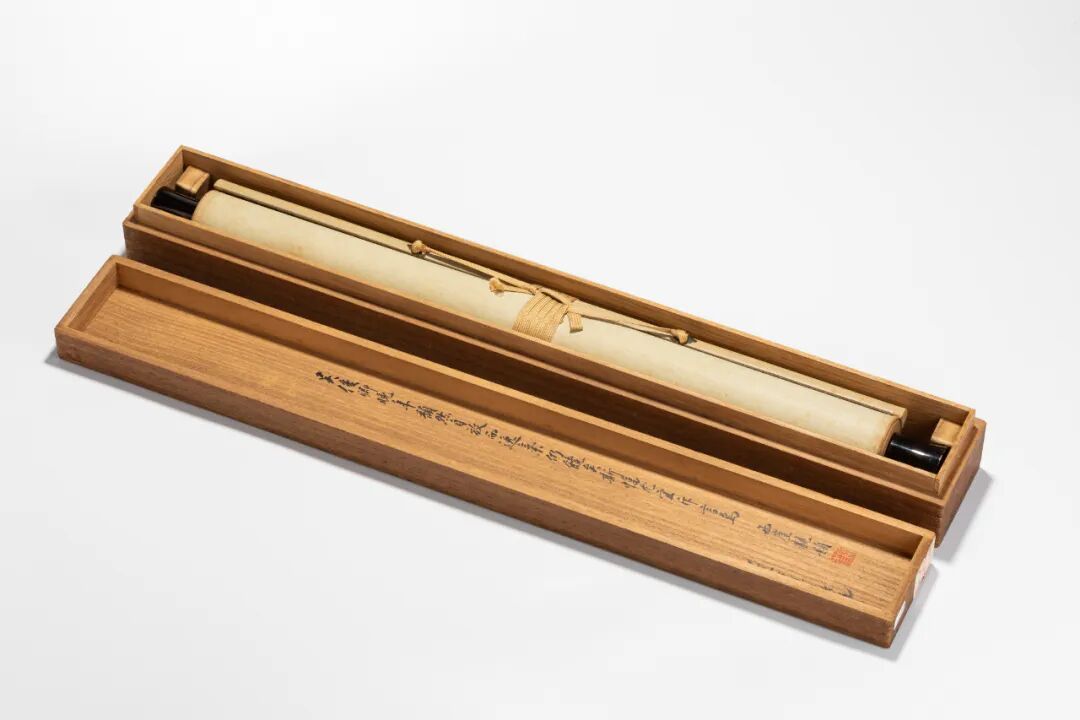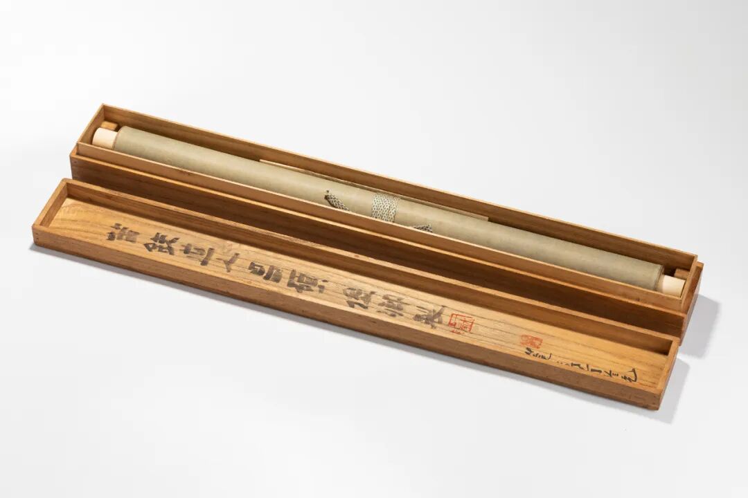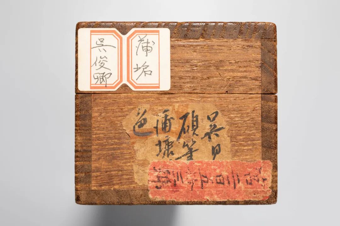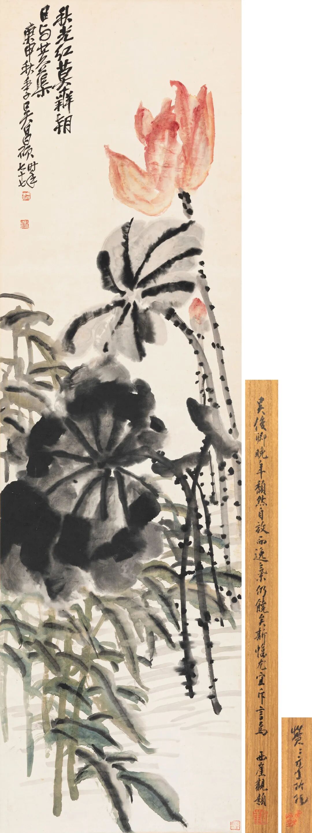 题识:秋光红莫辨,朝日与芙蕖。庚申秋季,吴昌硕时年七十七。盒内题:吴俊卿晚年颓然自放而逸气,仍饶矣斯幅尤宜斥言乌。西崖观题。西崖(白文)苍苍亭珍玩。此作品是典型的吴氏红花墨叶法,构图盈满层次鲜明。荷叶以墨笔大块铺就画面,中部两朵荷花以胭脂色先晕染后勾出花瓣墨色明快娇艳欲滴。画面上方一朵荷花已然是盛放过后一片花瓣若似即将凋落。荷花挺秀水草荇荇,确实是一派秋季荷塘的真实写照。吴昌硕作画时,必先入画境而后落笔。一日他去城外观荷,秋雨点点来急,他便问乡民借来一顶斗笠,看横塘十里破荷,他只取一莲秋水。吴昌硕在河堤上时走时停,并不心急,因为他知道: 走得快又如何,前面不也是风雨吗。待归去画图,未题诗,已先有诗意。吴昌硕的荷花图中极少见到一丝水痕,却泛着浓厚的水墨气息,这也是很多人称赞他如徐渭、陈淳在世的原因。亦师亦友的任伯年从未怀疑过吴昌硕的绘画潜能,初见吴昌硕作画时,他便大发感慨:“你的笔墨已经胜过我了”。盒内题识“西崖观题”,应该是20世纪最著名的日本东亚美术史家,密教研究者“大村西崖”。据资料记载大村西崖的中国之旅除第五次是从日本外务省对华文化事业部获得资助外,其余全部为自费。他的一系列访问的主要目的是收集中国美术的研究资料,但同时也促进了当时中日两国美术家之间的交流。作为推进文人画复兴运动的一环,他在旅行日记中还收集现代文人画家创作的作品等。回国后,他在东京美术学校等地举办展览,使日本人首次了解到当时活跃着的中国画家——北京的金城、陈师曾,上海的王一亭、吴昌硕等,从而促成了当时中日画家的交流盛况。