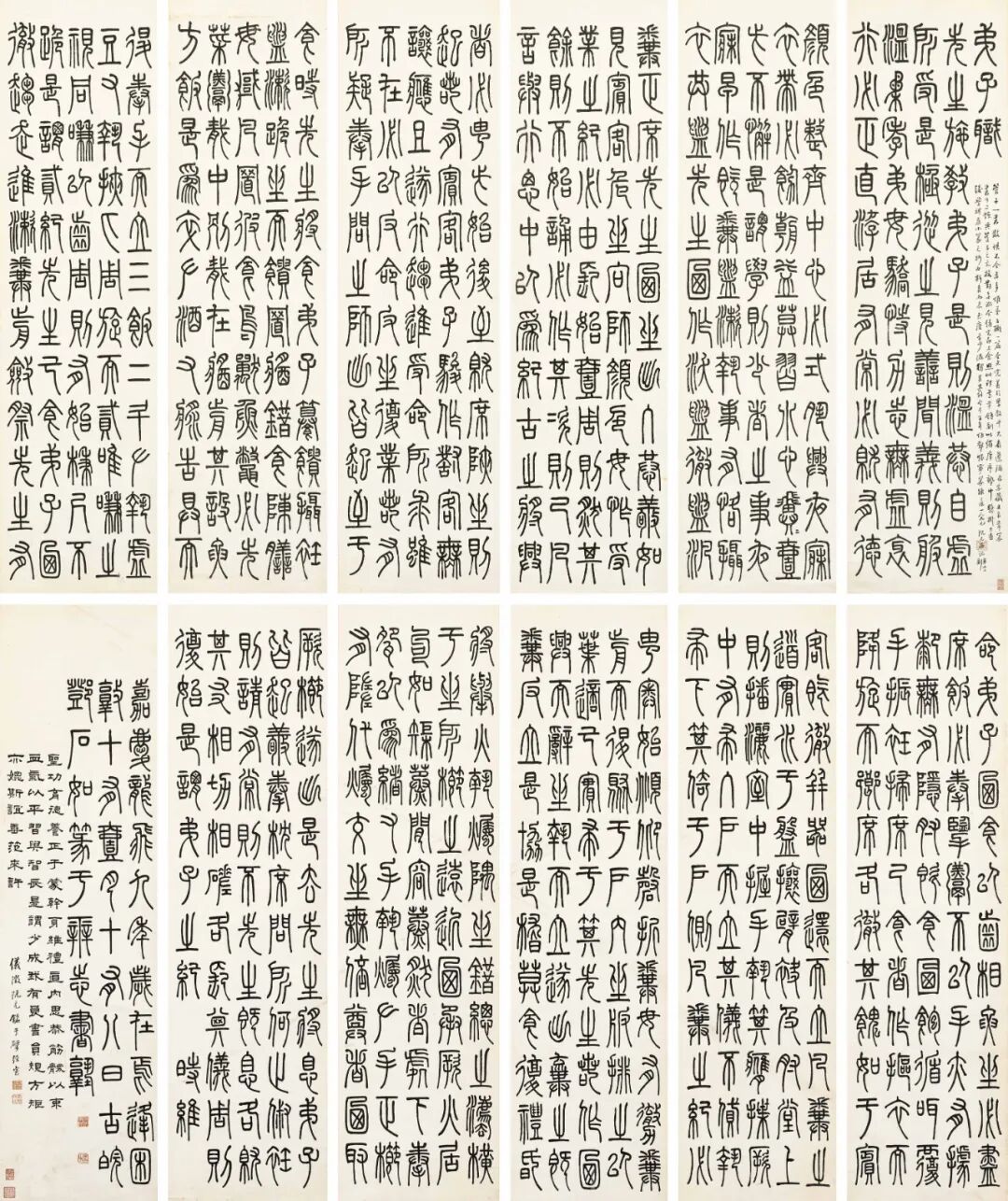 Lot 3052 邓石如(1743-1805) 篆书《弟子职》十二屏尺寸:176.5×46.3cm×12,约7.4平尺(每幅)题识:时维嘉庆龙飞九年,岁在焉逢困敦十有一月十有八日,古皖邓石如篆于辨志书塾。①《管子》一书散佚不全者多,惟《弟子职》一篇全文完善,于学教中大有遵循。余家藏王良常篆书十二帧,与管子之文校对无讹。今倩完白上舍照此计书二十余副,以备庠序塾中悬挂,大有后学裨益。小篆之妙,由斯喜而来,至唐李少温独善其能。今千百年惟邓怀宁篆隶之法一人而已。阮元再记。第十二副。【钤印】阮元伯元父印(朱文)②圣功育德,养正于蒙。干身维礼,直内思恭,筋骸以束,血气以平。习兴智长,是谓少成。我有良书,圆规方矩。亦媲斯谊,垂范来许。仪征阮元铭于揅经室。【钤印】阮元之印(白文)伯元氏(朱文)收藏印:许质卿家珍藏(朱文)渤海许氏收藏金石书画之印(朱文)南浔周氏梦坡室珍藏(朱文)