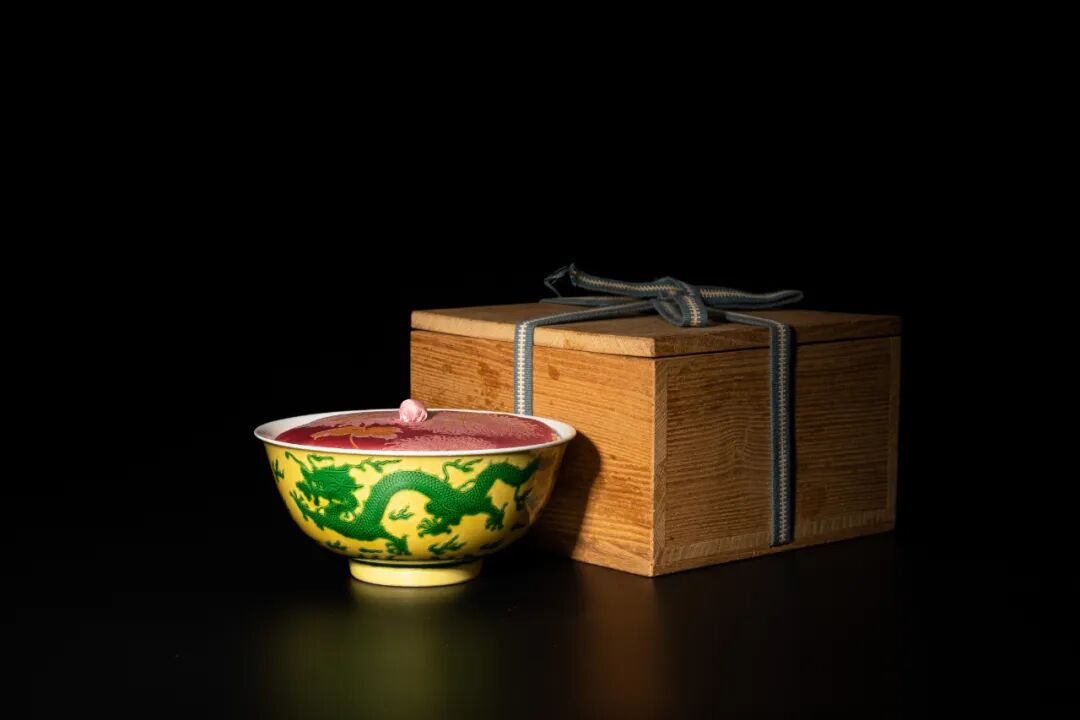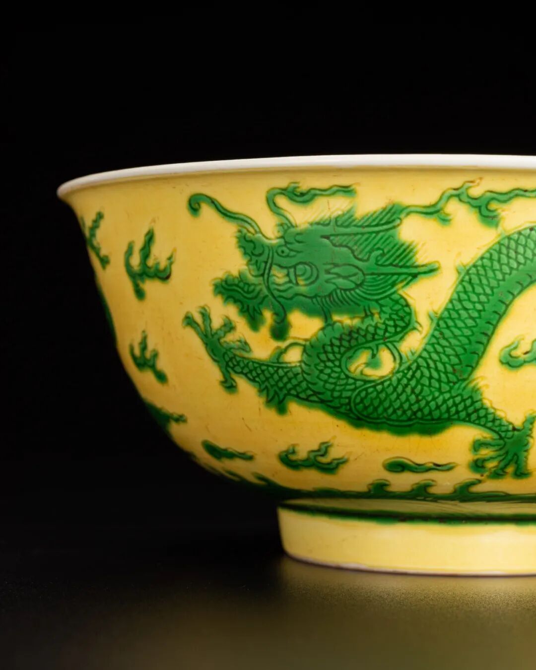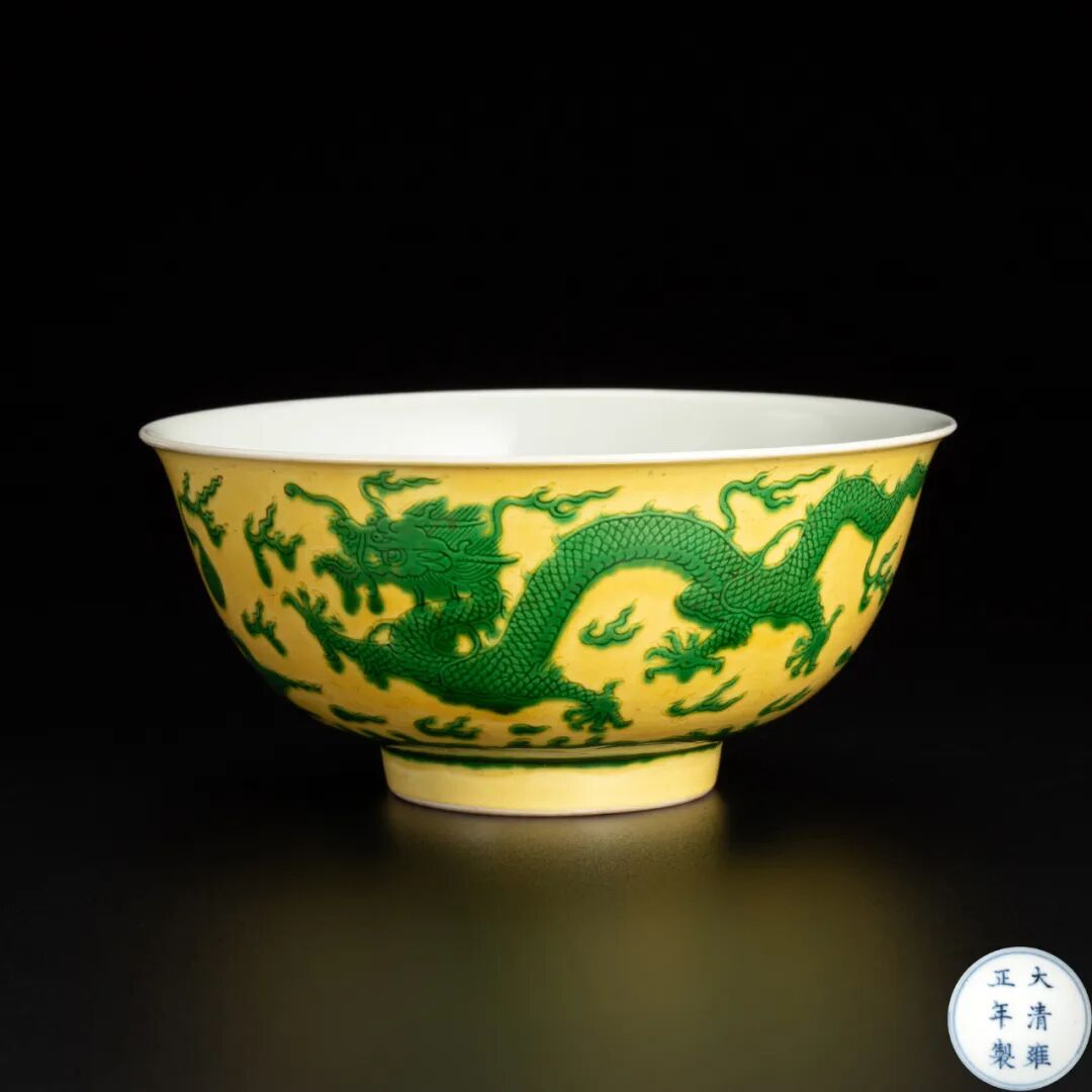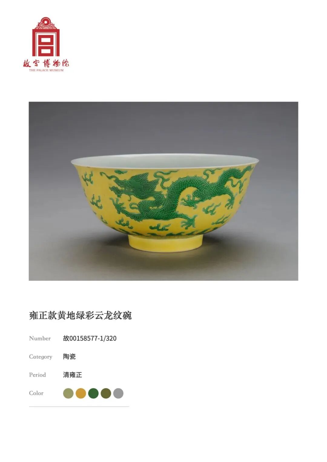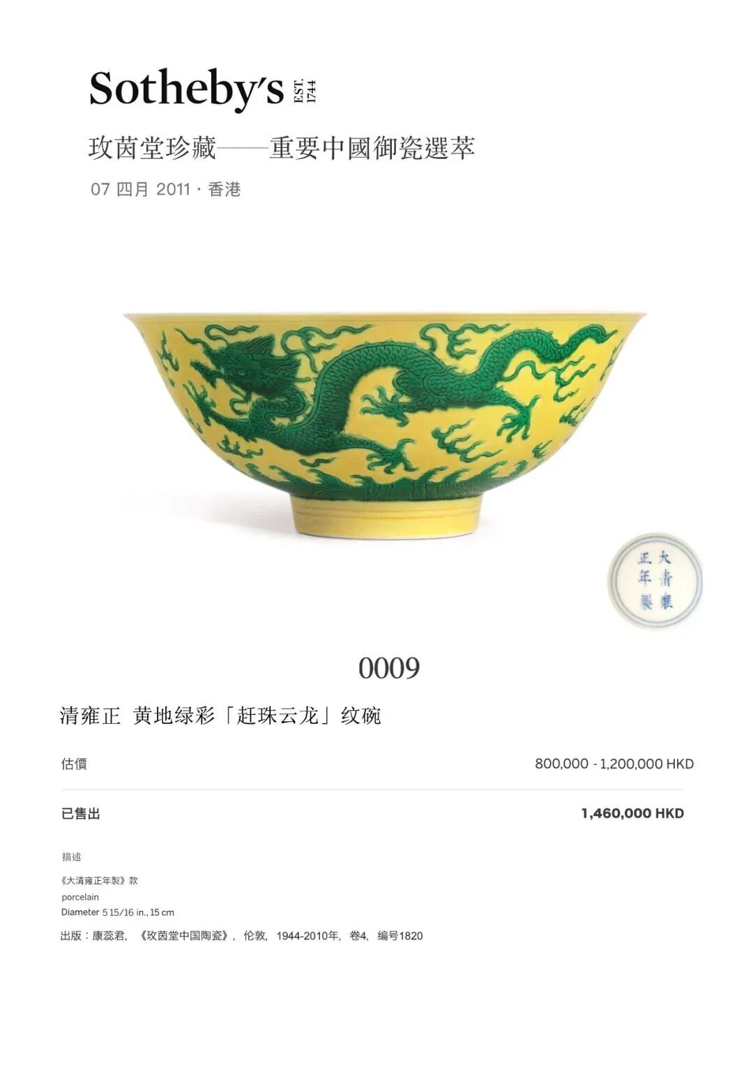 1.北京故宫博物院藏,文物编号00158577-1/320。2.香港苏富比,2011年4月7日,编号0009。黄地绿彩工艺最早出现于明初永宣时期,清康熙朝恢复烧造。其具体做法为先在素胎上锥刻纹饰,然后以高温烧成涩胎,复施黄釉绿彩,再低温烘烧而成,整个流程极为复杂,因此在明清两代御窑之中,相对其它品种而言,黄地绿彩瓷的烧造数量可谓少之又少。此碗撇口,深弧壁,深腹,圈足。器内施白釉,外壁黄釉为地,腹部刻云龙纹,皆填绿彩,外底青花双圈内书“大清雍正年制”双列六字楷书款。所绘五爪龙纹,双目圆睁,龙身蟠曲成弓字形,腾跃于天穹之中,有叱咤风云之势,尽显巨龙之霸气。黄绿彩釉相互映衬,搭配协调,纹饰排列有序,极富装饰效果,具有极强的艺术感染力。此种碗当时专供贵妃使用,参阅《钦定宫中现行则例》卷三“铺宫”条载:“贵妃:黄地绿龙瓷盘四件、各色瓷盘三十件,黄地绿龙瓷碟四件、各色瓷碟十件,黄地绿龙瓷碗四件、各色瓷碗四十件,黄地绿龙瓷钟二件、各色瓷钟十五件,瓷小缸一口”。黄地绿彩“赶珠云龙”碗大多以明朝正德、嘉靖及万历年间创烧原器纹饰为基准。清朝年间,黄地绿彩云龙碗多为康熙及乾隆者,罕见雍正作例。2011年4月7日,编号0009。