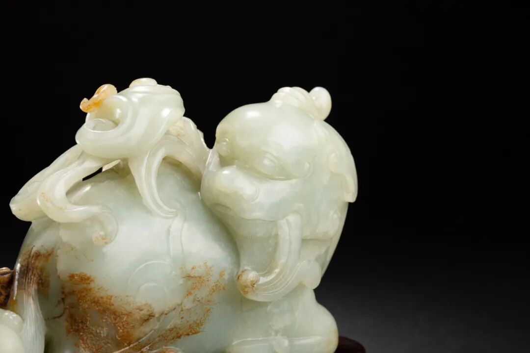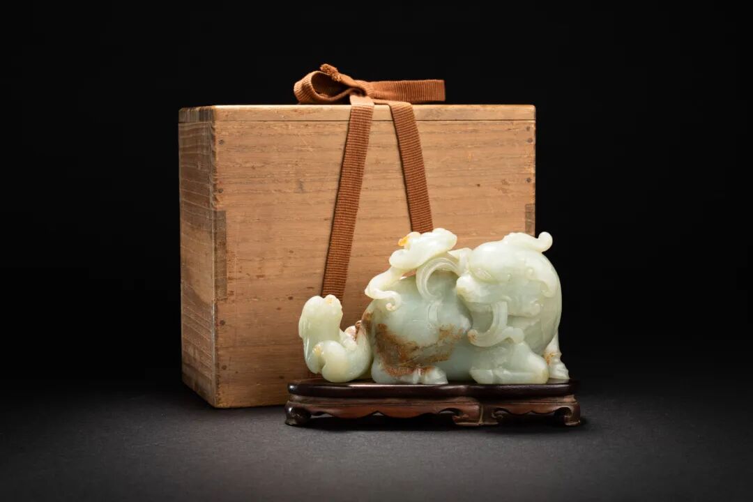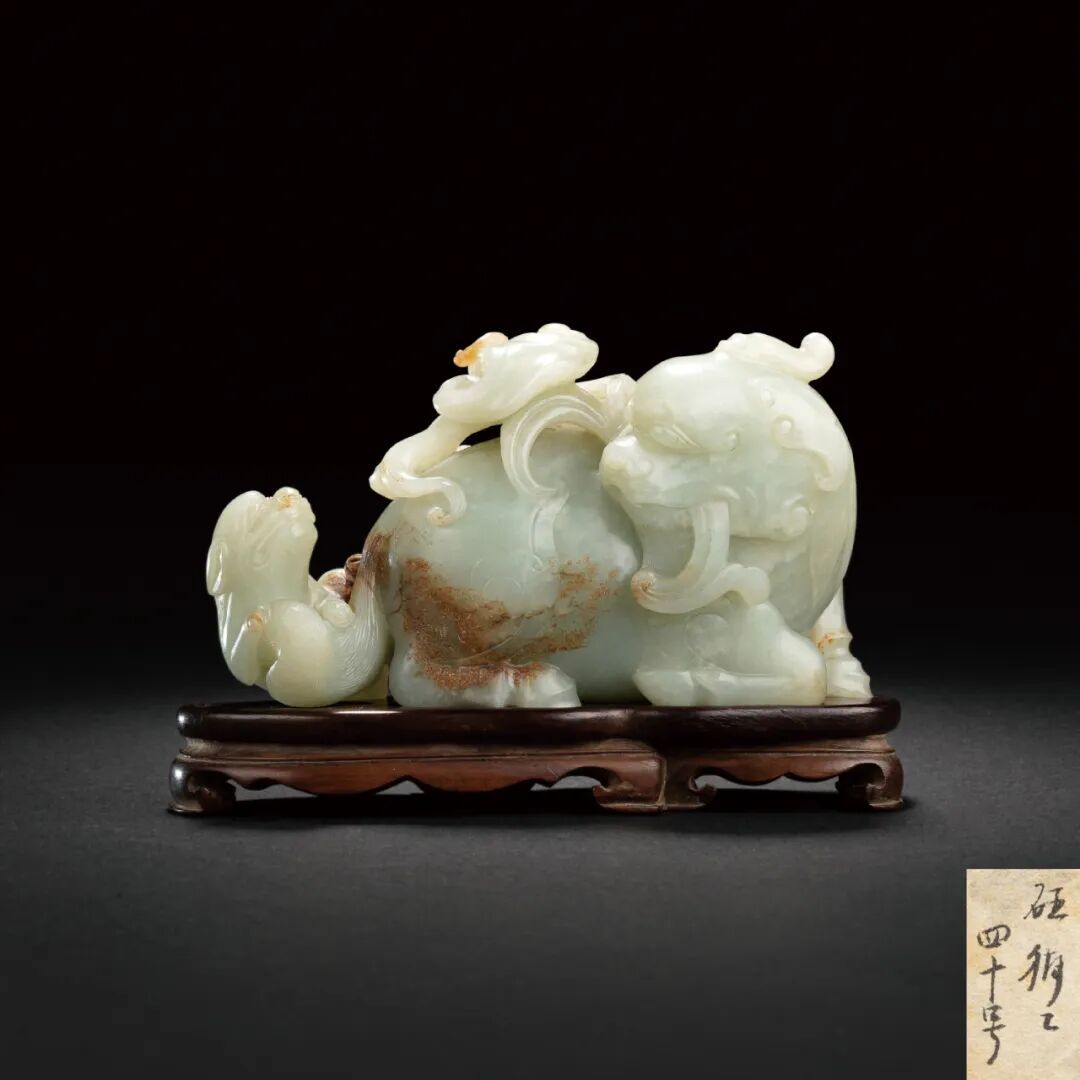 瑞兽作跪卧之姿,立体圆雕而成,形似天禄。兽首如狮,转向身侧微仰,阔口衔灵芝仙草,如意鼻,双眼硕大,眼球凸出,双耳贴头,首生独角,四肢以高浮雕塑形,背部浮雕如意,长尾卷曲,肌骨丰健,神态怡然自得。身旁幼兽仰卧,母子顾盼,置身仙灵圣境。本器用料上成选材为和田籽玉,色泽纯正匀净,细密温润,其上有黄褐色的沁色,沉着凝厚,工艺精湛为乾隆工,雕琢细致入微,且有长寿如意、子孙祥乐的美好寓意,应为皇家旧藏,十分珍贵。