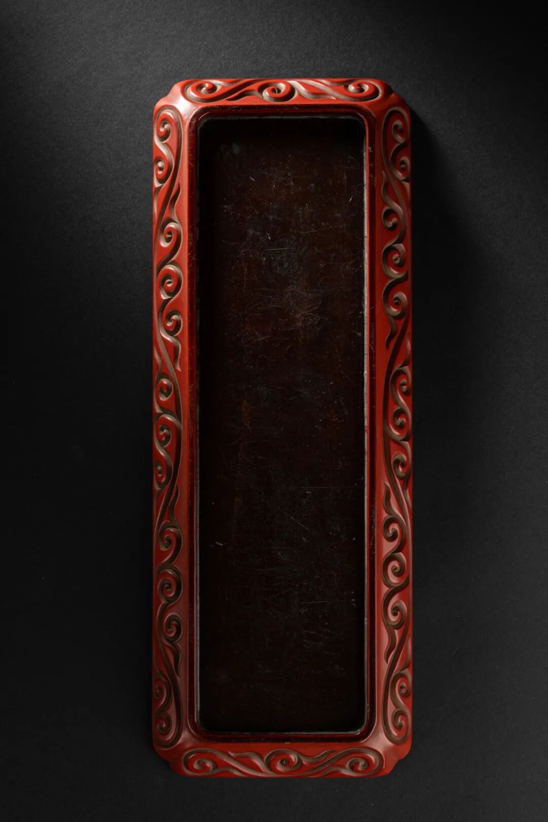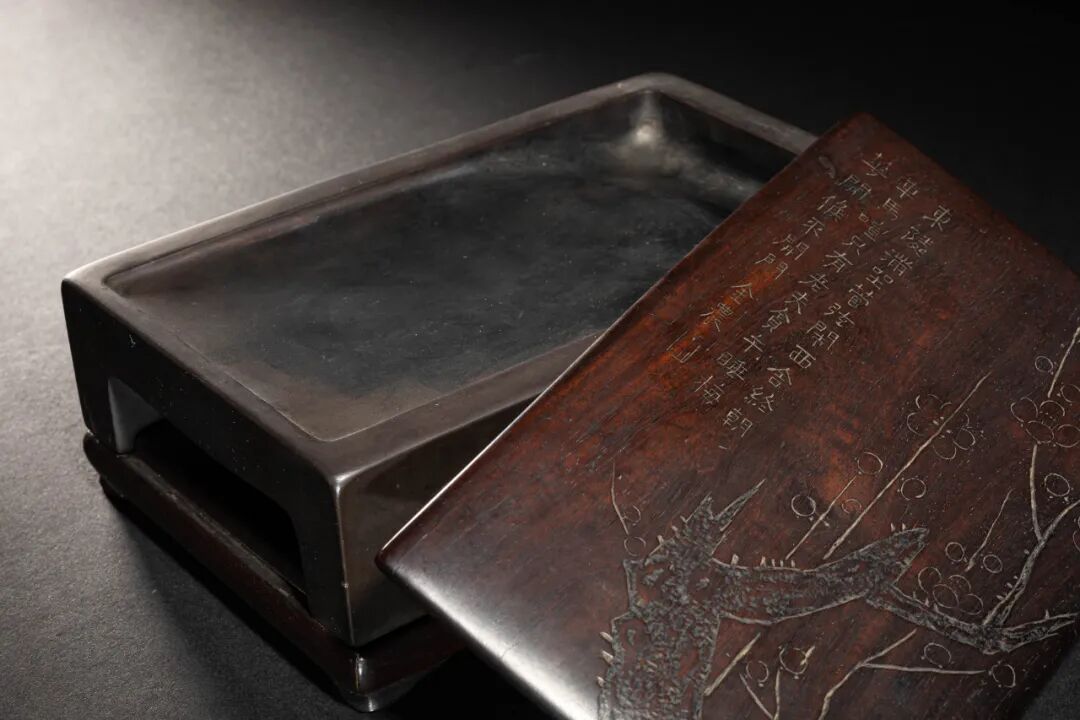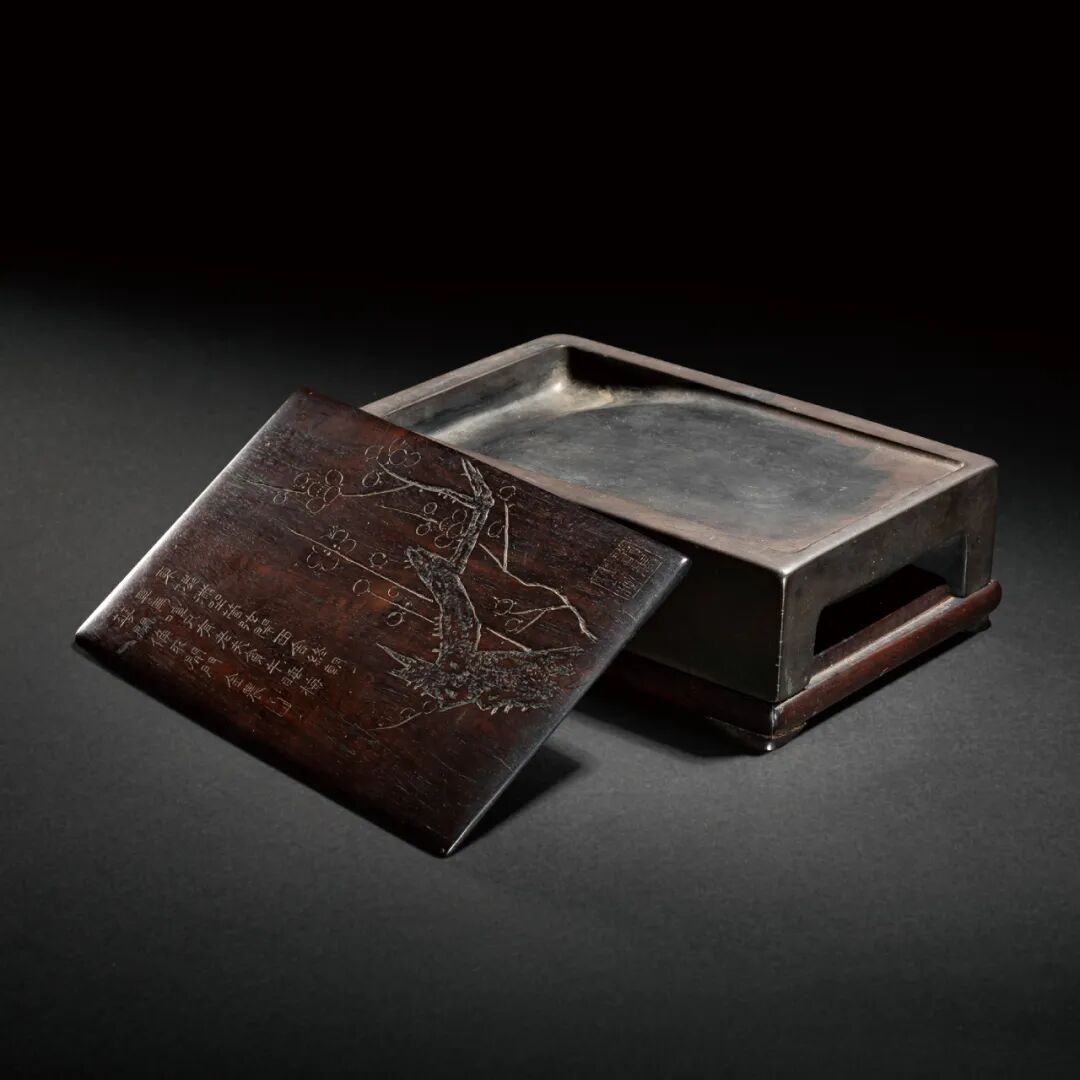 砚盖题识:东邻满座管弦闹,西舍终朝车马喧。只有老夫贪午睡,梅花开后不开门。金农;寿门;丛书楼藏。金农嗜好藏砚,拥有佳石一百二十方,自号“百二砚田富翁”。此件太史砚便是金农所用砚,选材为老坑端石所制,色紫红石质细腻幼嫩,石上有名贵的石品花纹,做抄手式。作为文房四宝之一的砚台,发展到了宋代,最具时代特征的形制当为抄手砚了,又称太史砚,砚面平直,墨池窄浅略呈一字形。砚体呈前低后高状,左右及下端外侧内敛。砚背制抄手,下端无堵,平正庄重,线条简练,形制古朴。金农,身世坎坷,不能得意,咏梅即为吟咏身世之不平,梅花严寒怒开,不畏风雪恶劣。其砚盖诗文正蕴含了诗人本人不畏时世艰难,却又无人赏识的尴尬境地,寄意诗画正为了留存心性。咏梅、画梅是金农一生中永恒的旋律,其十分重视意境的营造和情感的表达,以梅遣兴墨戏,是金农捕捉心灵和客观景物刹那间共鸣的一时印象,仿佛随手拈来,即成文人画卷,令人回味绵长。右下有一方鉴藏章“丛书楼藏”为清代著名盐商、藏书家,马曰琯马家兄弟二人的藏书楼。金农一生好友众多,“西泠八家”之首的丁敬,厉鹗,杭世骏,汪士慎,马日琯、马日璐兄弟。马家兄弟家庭豪富,为人慷慨,喜为诗、藏书、结交文士。雍正时在扬州筑小玲珑山馆,“四方人士闻名造庐,授餐经年,无倦色”。著名学者全祖望、厉鹗、金农、郑板桥、陈章等皆小玲珑山馆常客。由此可见此砚为金农用砚,后为马氏兄弟家藏,传世至今实为珍贵难得。