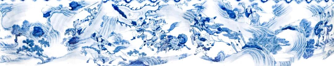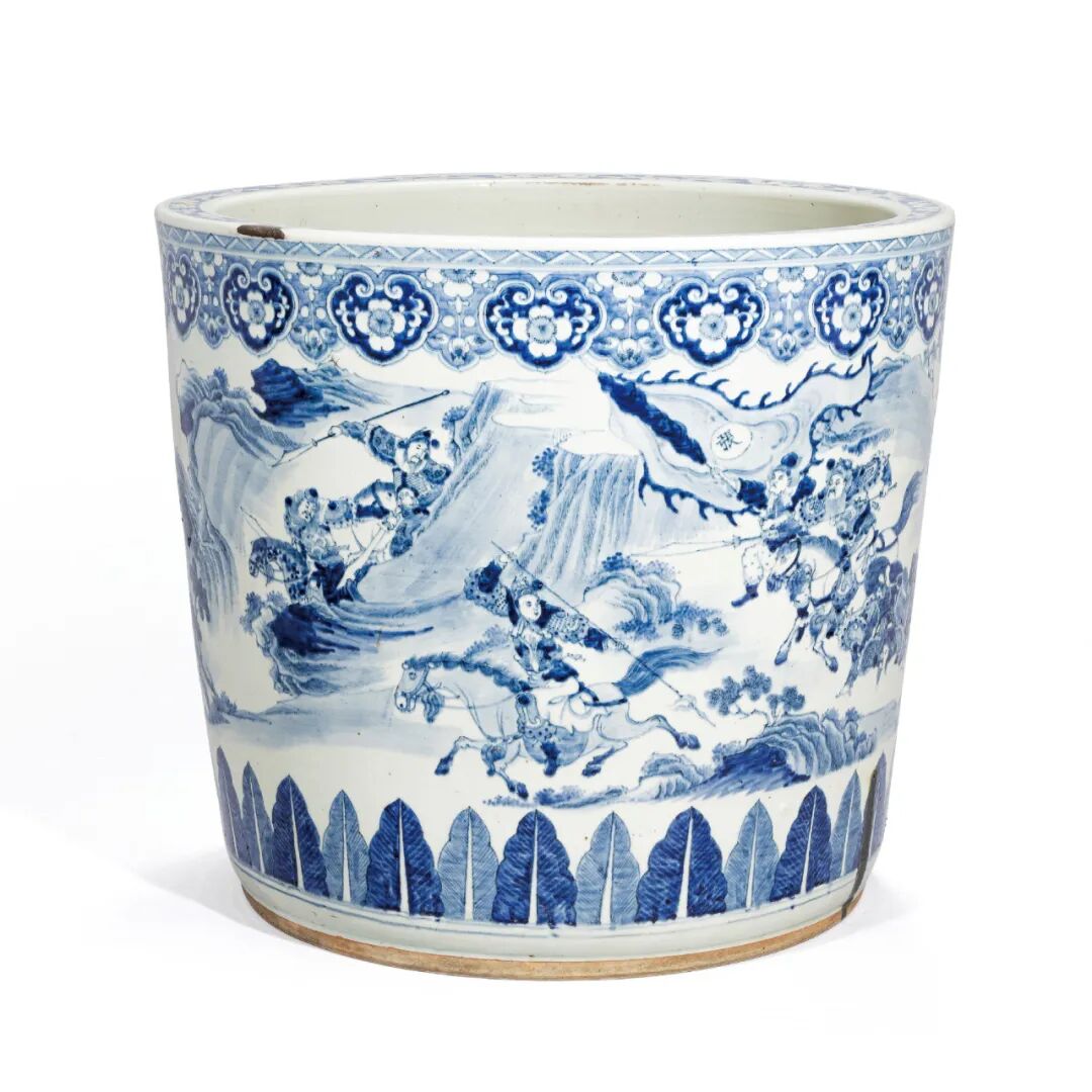此件拍品为一件青花绘三国人物故事花盆,盆体呈筒型,平沿,底部中间有圆形流水孔。腹身之上通景绘赵子龙救主图。三国常山赵子龙的故事家喻户晓,尤其是他匹马单枪闯入曹营救出幼主阿斗之事,使得其勇猛忠义的形象深入人心。图中赵子龙手持亮银长枪,身骑宝马,单人独骑,器宇轩昂。敌我双方人物刻画生动,线条流畅,青花墨分五色,有水墨国画的效果。瓶口及胫部以如意纹、蕉叶纹等装饰,构图疏朗大气,所绘山石线条硬朗,分水鲜明。青花发色浓淡相宜,层次分明,保存完好,为清代中期不可多得的青花人物故事陈设器。