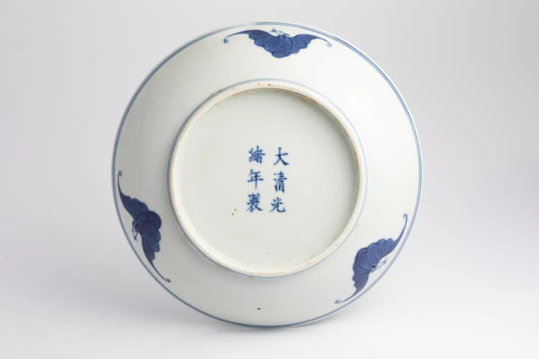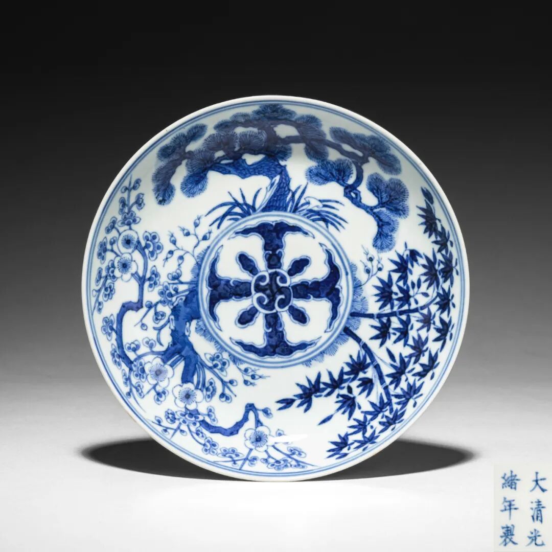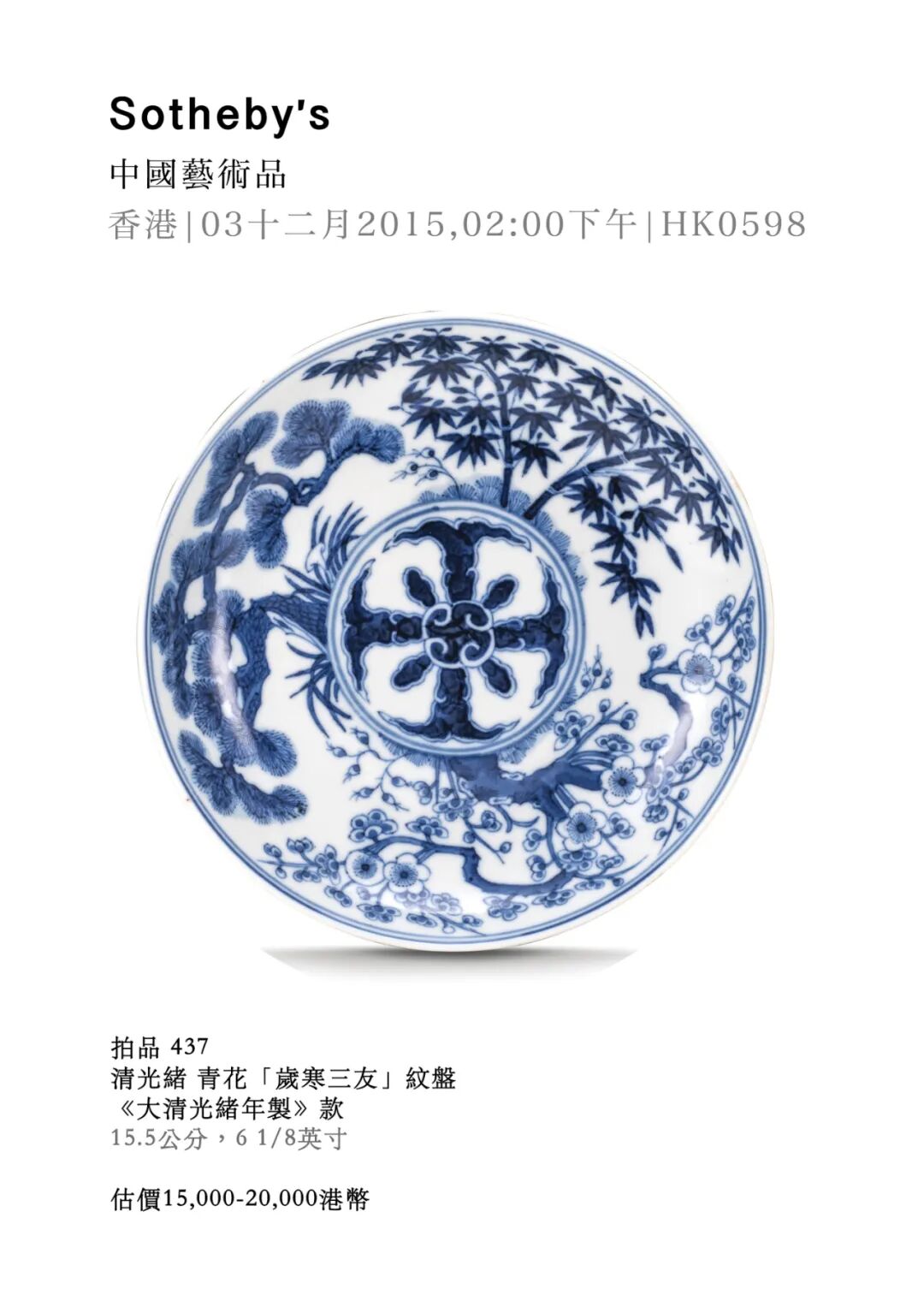 来源:香港苏富比,2015年12月3日,编号437。此盘撇口,浅弧璧,圈足,通体以青花为饰。盘心青花双圈,内绘四出云纹,中间似柿蒂状涡纹,颇具仿古意趣。盘内壁主题纹饰为松竹梅,岁寒三友图,画中以青花绘就苍松虬枝盘曲,傲骨铮铮,中间翠竹横欹而出,清秀潇洒。右侧冬梅破蕊怒放,历寒雪而暗香愈浓,衬以小草。盘外壁绘祥蝠相衬。底部有青花楷书“大清光绪年制”款。从此件拍品可见光绪时青花纹饰多样,画法更简明,布白更平稳,内容更丰富。在青花绘制中,咸丰、同治青花瓷大多仅浓淡两个层次,光绪青花在技术上远远超过咸丰、同治时期,与康熙时期青花一样,所以光绪御窑也被称为“小康窑”。![]()
