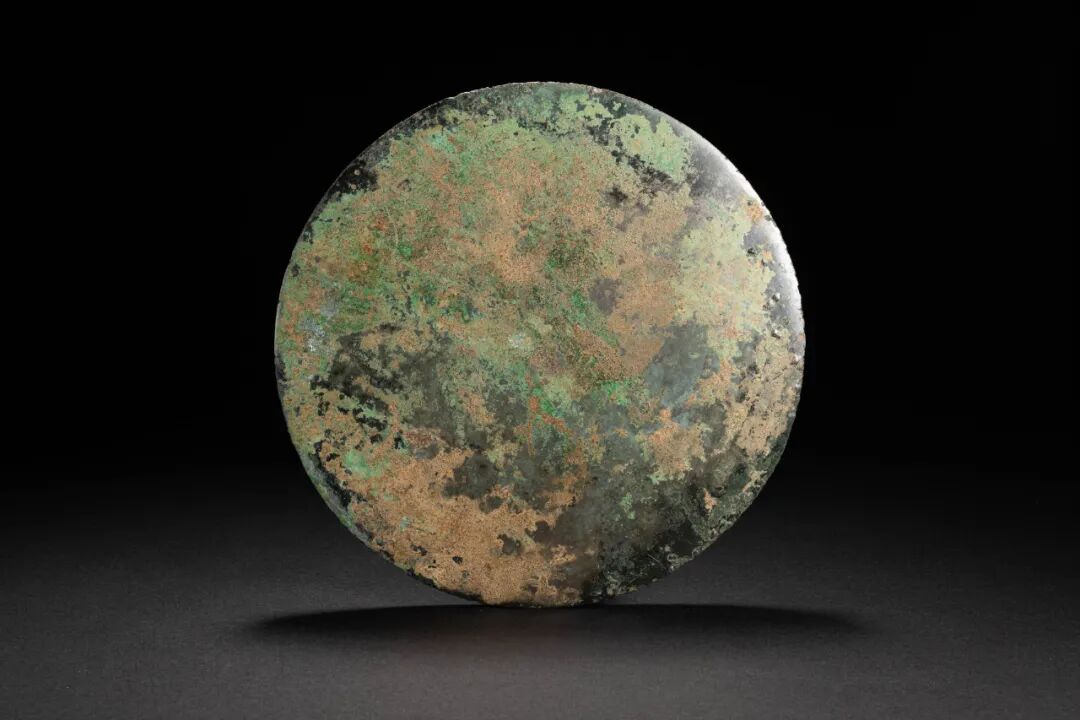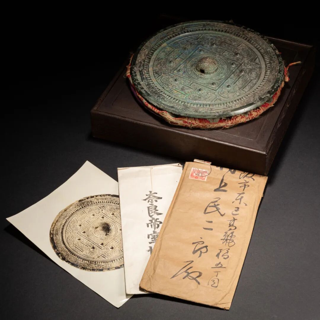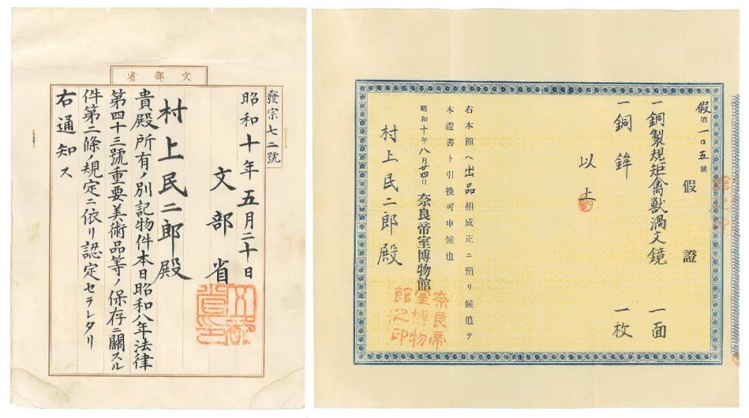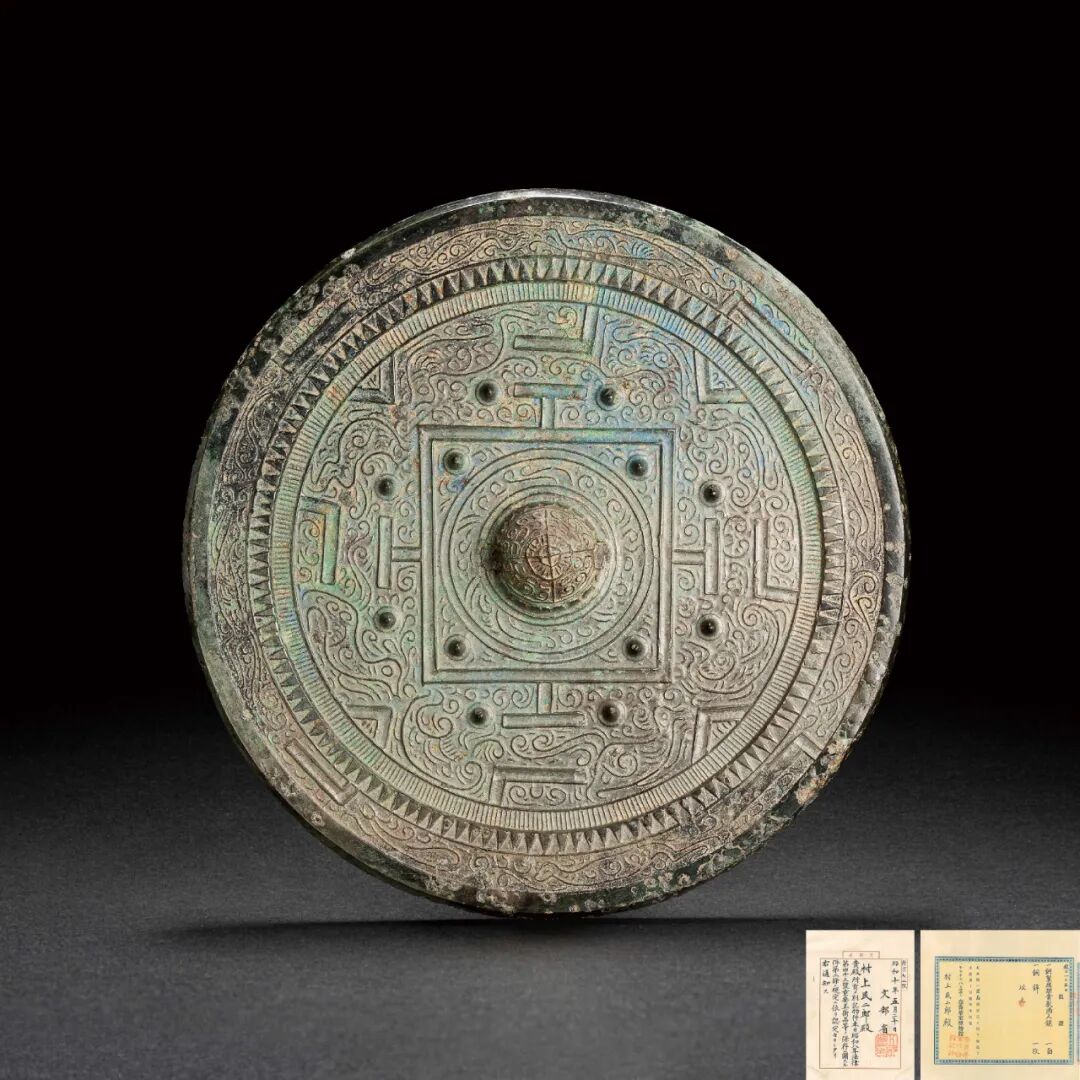 此件拍品为规矩地乳钉神兽纹青铜镜,黑漆古上有蓝绿锈色,品相完好,纹饰清晰,外圆饰连续双线锯齿纹,镜内神鸟卷草纹饰。圆形镜钮周围饰两重环、方框纹饰,寓意天圆地方,框内四乳钉,框外八乳钉。镜内圈饰卷云纹。方框纹饰对角和每个边框处,分别有TLV形纹饰,疑为伏羲、女娲手中规天矩地的神器,据此,称为规矩镜,也有国外学者称之为TLV镜,也有叫博局镜、八极纹镜等。此类纹饰由于也出现在汉代天文用具——日晷上,也叫日晷镜。所有这些名称,都表达了古代先人心目中的宇宙图式,有极为深奥的精神、文化内涵,规矩镜在两汉极为流行,也是铜镜中最为博大精深的。此件铜镜有“奈良帝室博物馆”出具的证书一份,亦有日本“文部省”出具的收藏证明,原为日本收藏家“村上民二郎”收藏。