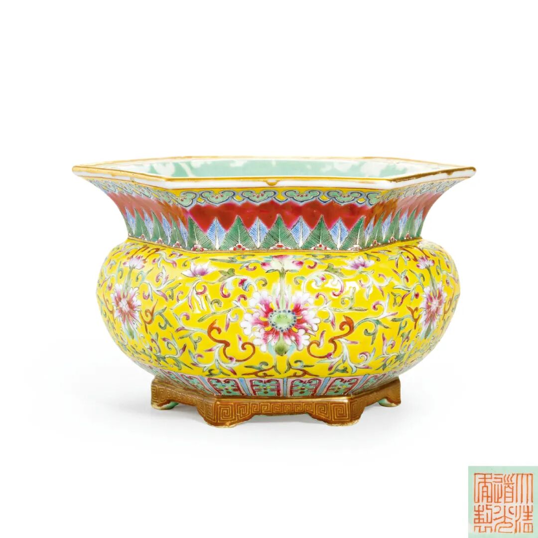 Lot 2100 清道光 黄地粉彩缠枝花卉纹六方花盆此件黄地粉彩缠枝花卉纹六方花盆是道光时期官窑御制,整器呈六方形,寓圆于方。板沿外涉,板沿口上外侧描金内侧黄地绘粉彩缠枝花卉,内施松石绿地釉,盆内未施釉。口沿外侧设色华丽,最上为黄地绘粉彩,彩绘连缀的如意纹饰,中间为洋红彩填充,其下绘蓝绿二色粉彩蕉叶纹饰,绿蕉叶纹饰下有粉彩三瓣散花装饰。器身为黄地绘缠枝宝相花纹饰,缠枝细劲宛转,宝相花饱满端庄,器腹下绘粉彩仰莲瓣纹。其下承六方几座型兽面足,其上施酱釉绘方折云纹。器底施松石绿色釉,中间留白矾红篆书“大清道光年制”双行六字款,字款两边各留有圆形出水孔。整器造型端庄俊秀,施彩富丽典雅,为道光朝官窑内府陈设用瓷。