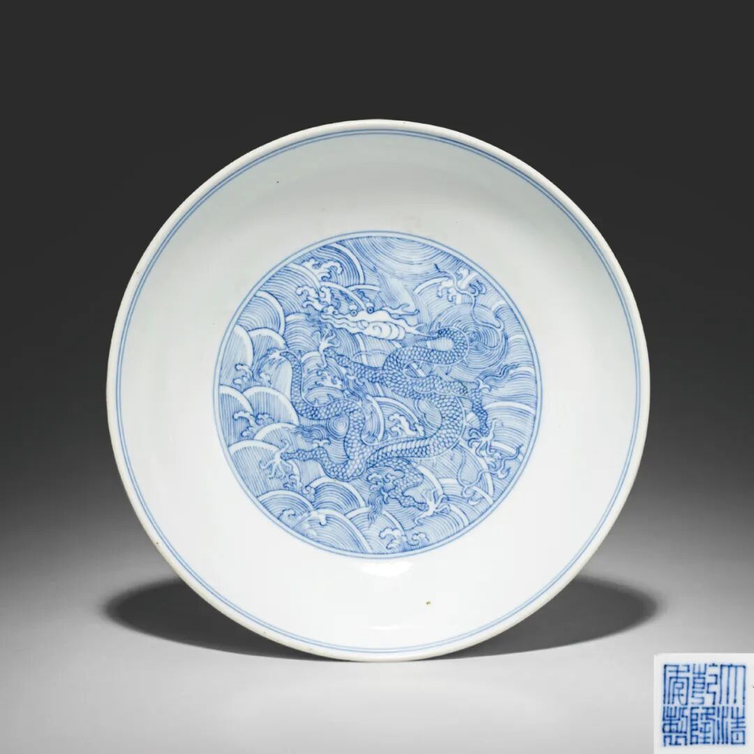 此件拍品的海水龙纹为仿明宣德青花海水龙纹盘式样,盘心以青花淡描海水龙纹,外壁游龙首尾相逐,间饰海水浪花通景纹饰,所绘龙形矫健,身体修长,双目炯炯。此盘主题纹饰为“九龙闹海”,盘心立龙象征帝王,盘外壁所设九条龙为帝王之子,在外守护疆土。古人以九为数之极,象征帝王多子多福。飞龙气势万千,穿梭海浪为地,将乾隆帝的思古之情与审美高度,纳于一身。游龙穿浪,跃于瓷上,象征帝王及皇权,此青花盘发色淡雅,纹饰强而有力,描绘精细流畅,器型规整端庄,底部青花篆书“大清乾隆年制”双行六字款。反映出当时乾隆御窑瓷匠的高超技艺。