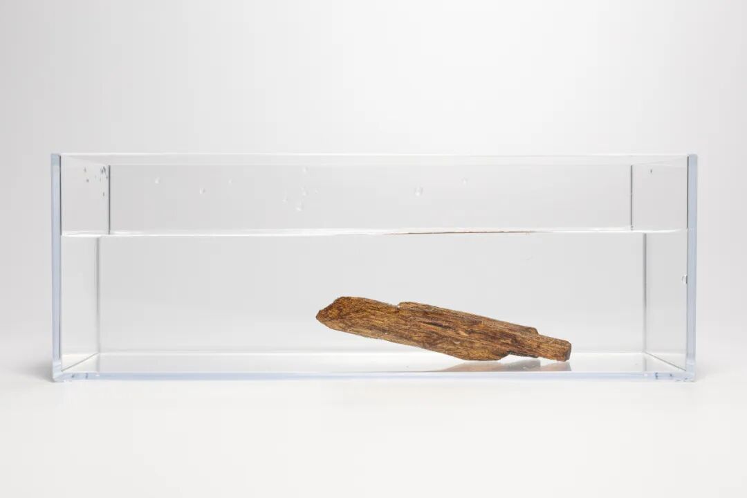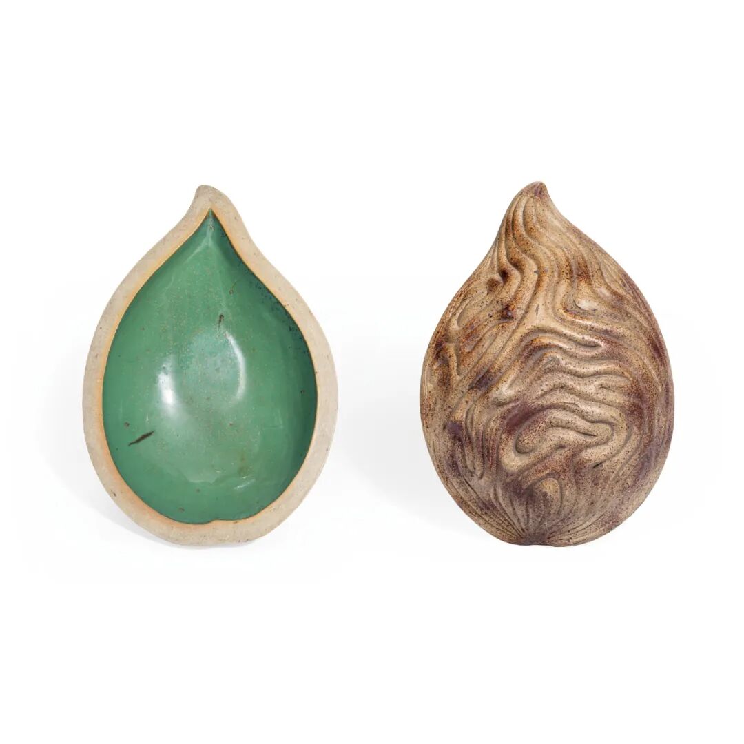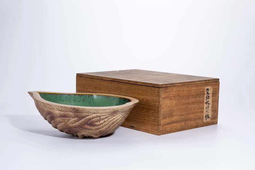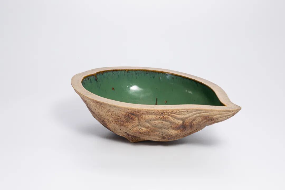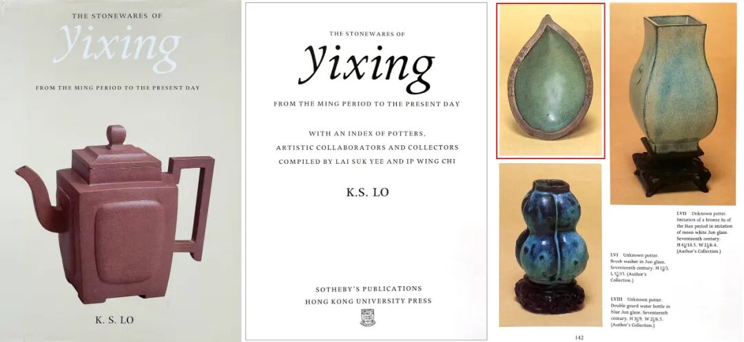 参阅:1986年出版《宜兴紫砂:从明代到今天》第142页,图LVI。此件拍品整体造型为剖开的桃核状,器外露胎,雕刻桃核筋脉纹理形色惟妙惟肖,其内壁施窑变青绿釉,其釉面光亮,釉层较厚,不透明,瑰丽变幻,非常注重釉色与型体的美,可谓匠心独运,为文房用器。宜钧釉从明末开始进献于宫廷,乾隆后较少,至清末民初又开始仿制。宜钧胎骨为紫砂,因存在时间短、制作昂贵,故留世甚少,较珍贵,现故宫也只有20余件藏品。
