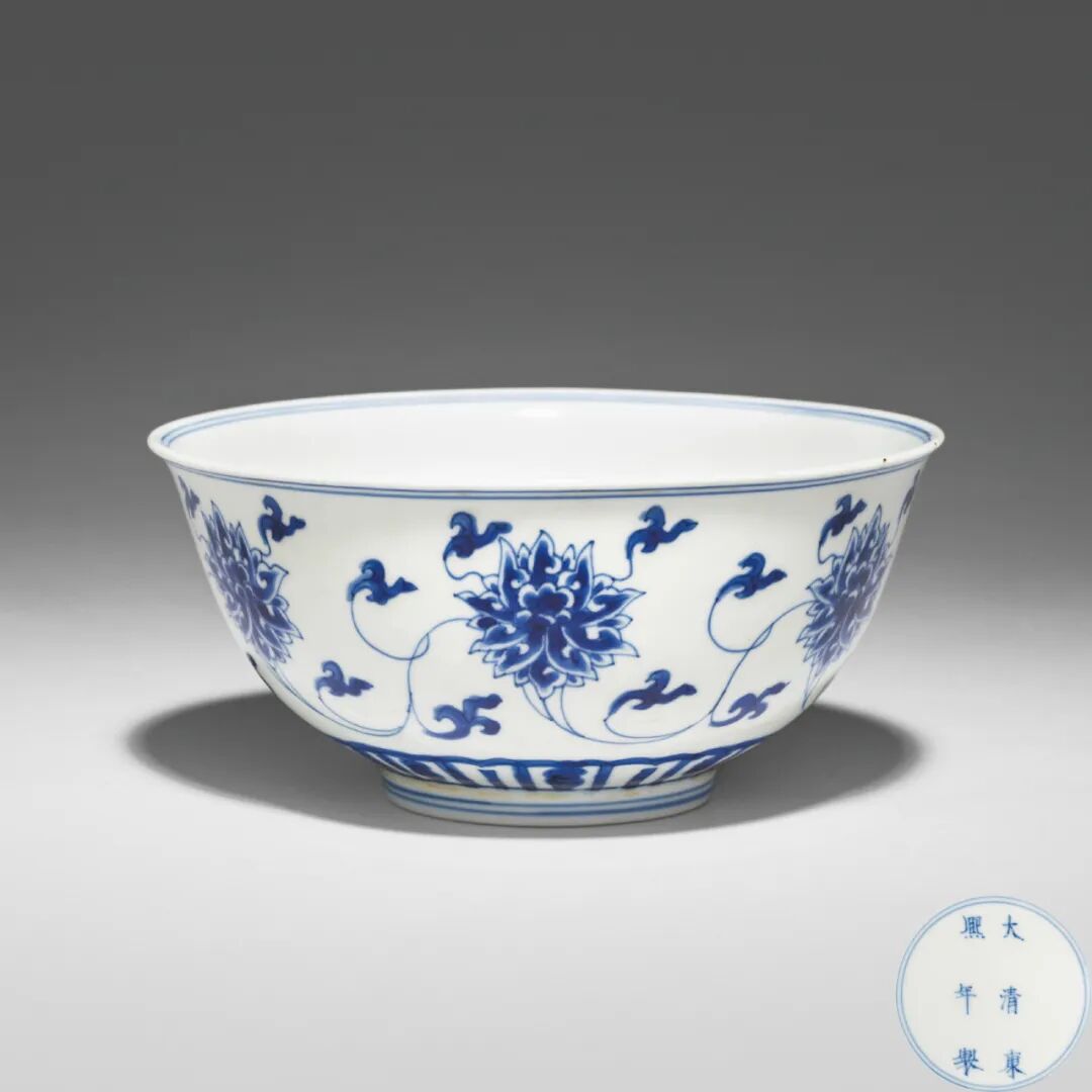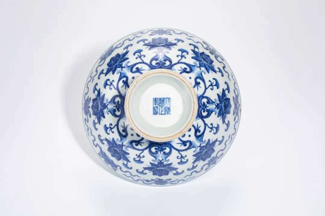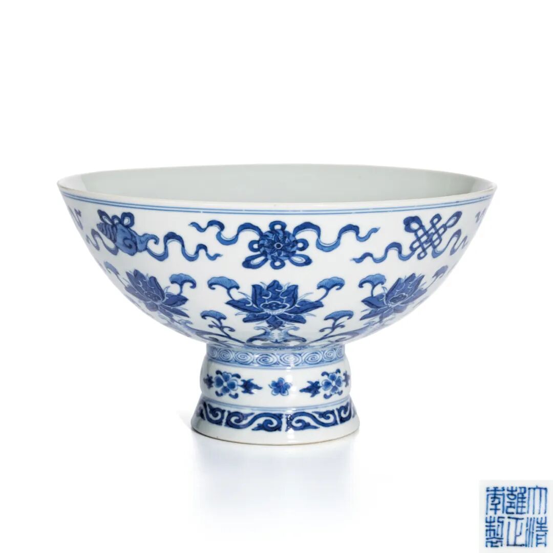 3.伦敦佳士得,2014年5月16日,编号1057。此件青花八吉祥高足碗,碗内壁为白釉素面,里心绘有团“寿”字;口外沿为青花双圈,外壁上部绘轮、螺、伞、盖、花、罐、鱼、肠八宝纹,中下部作番莲花纹,底部有变体云头纹;高足做成有起伏的三段式,其上纹饰亦为三层,其一为旋状雷纹,其二是装饰性花卉纹,其三是变体云头纹;碗底高足内有青花篆书“大清雍正年制”六字双行款。此件瓷碗采用淡色青花釉料,其釉色与光彩自然迥异于重彩青花,为清宫青花瓷釉的又一种代表类型。