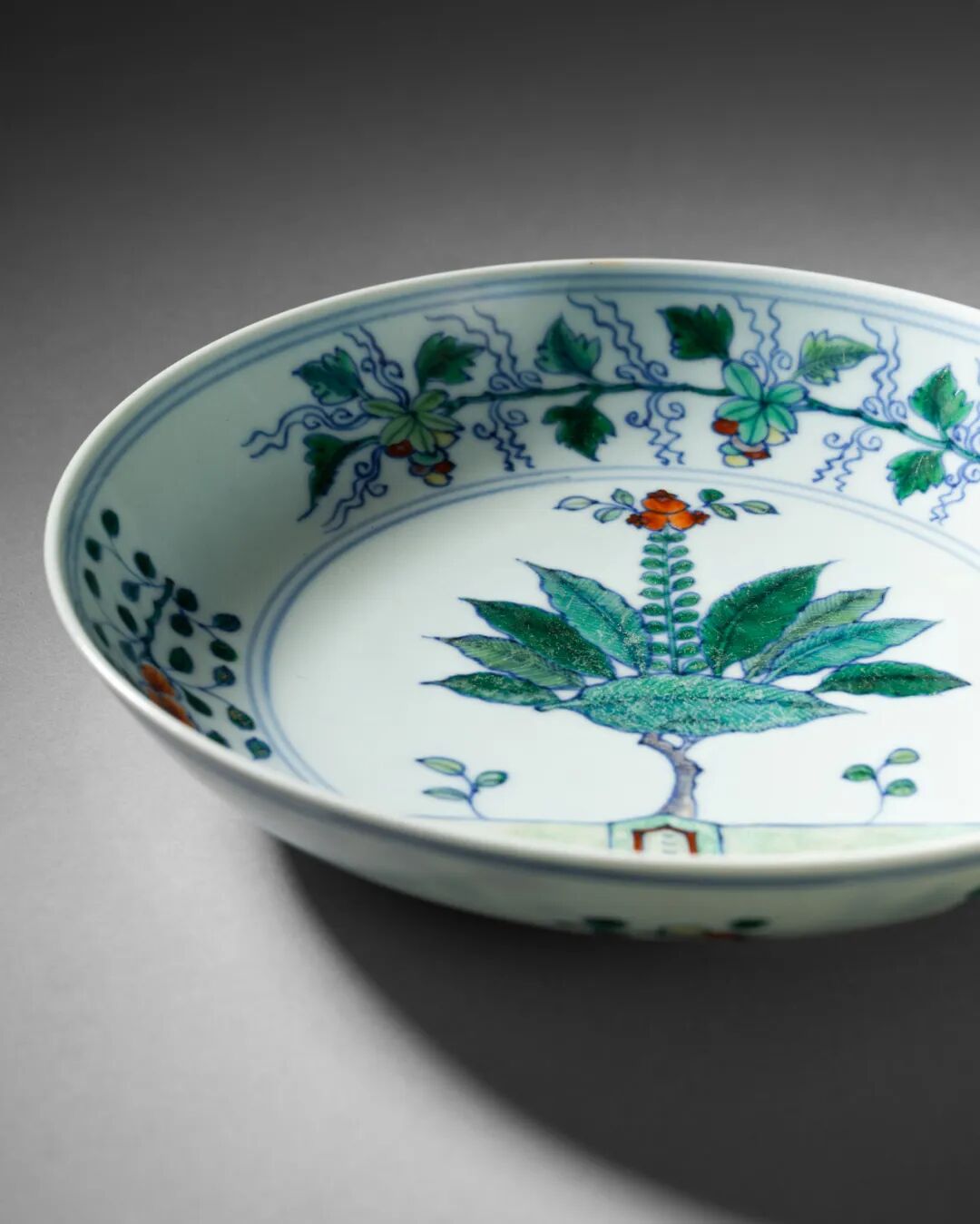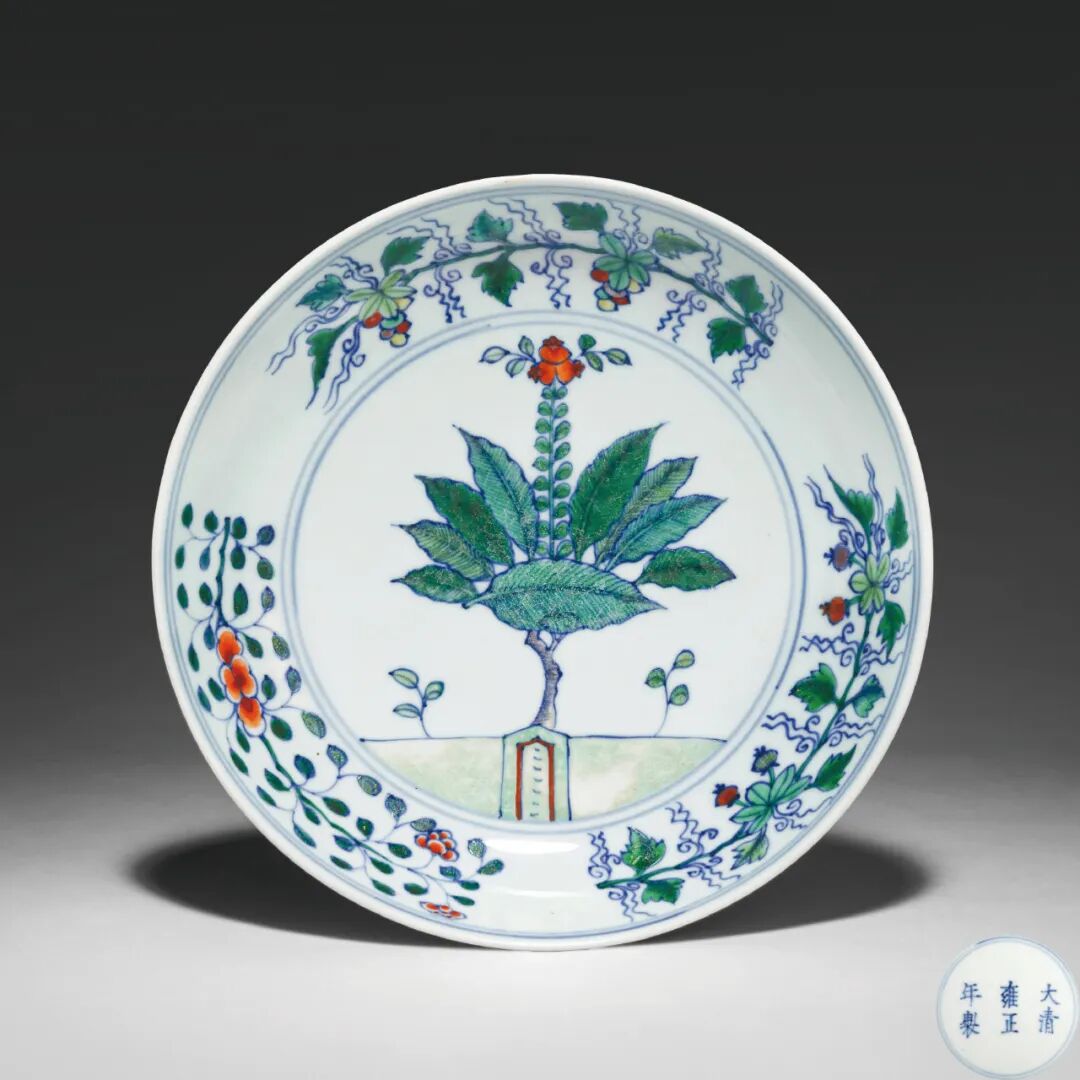 1.《胡惠春先生、王华云女士捐赠瓷器精品选》,上海博物馆,1989年,页80,图46。2.《成化瓷器特展图录》,台北故宫博物院,2003年,页48,图22。3.《故宫博物院藏清代御窑瓷器》卷一下册,紫禁城出版社,2005年,页66、67,图22;页84、85,图31;页114、115,图46。4.《斗彩名瓷》,叶佩兰,艺术图书公司,1993年,页70,图67。此件拍品与上海博物馆藏雍正斗彩花果纹盘品种相同,纹饰系仿自成化青花斗彩器。敞口,圆唇,腹部较浅,腹壁弧收,矮直圈足。通施白釉为地,釉色白中闪青,釉层饱满,釉质细腻莹润。盘内壁一组双圈青花同心线纹分割成内外两个纹饰带,外围绘有三组不同的花果纹。花枝缠绕,枝叶茂盛,花朵盛放,果实累累。盘心绘一株果树生长于山石之间,内外壁分别饰以三组折枝花果纹。盘外壁上缘施双圈青花线纹,其下施多组花卉纹。器底有青花双圈六字双行楷书款“大清雍正年制”。字款书法风格特殊,较少见于雍正斗彩,但与故宫博物院藏多件雍正青花器书风相类,此种字体亦和近来学者考证康熙晚年郎廷极兼理陶政时红釉器上的款字相符,据信均出自一人之手,由于郎廷极督陶在康熙四十四至五十一年(1705-1712),可以判断拍品为雍正早期的产品,对于理清雍正斗彩制作年份和康雍两朝官窑技艺传承,具有重要意义。全器胎坚釉润,彩料莹洁,风格秀丽脱俗。此类斗彩花果纹盘传世较少,且品相良好,极为难得。